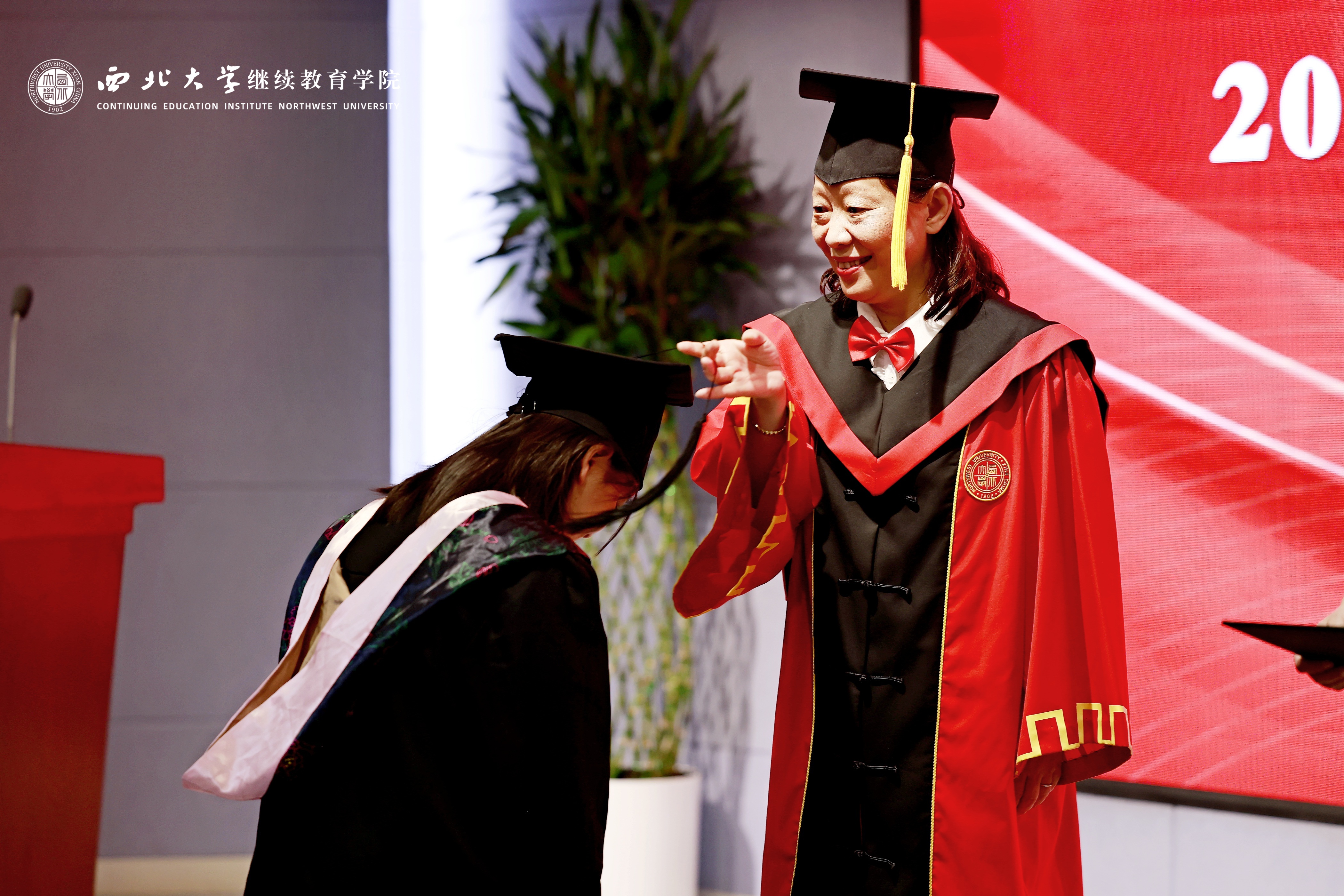 曹蓉和继续教育学院负责人为获得学士学位的学生代表拨穗正冠、颁授学位并合影。