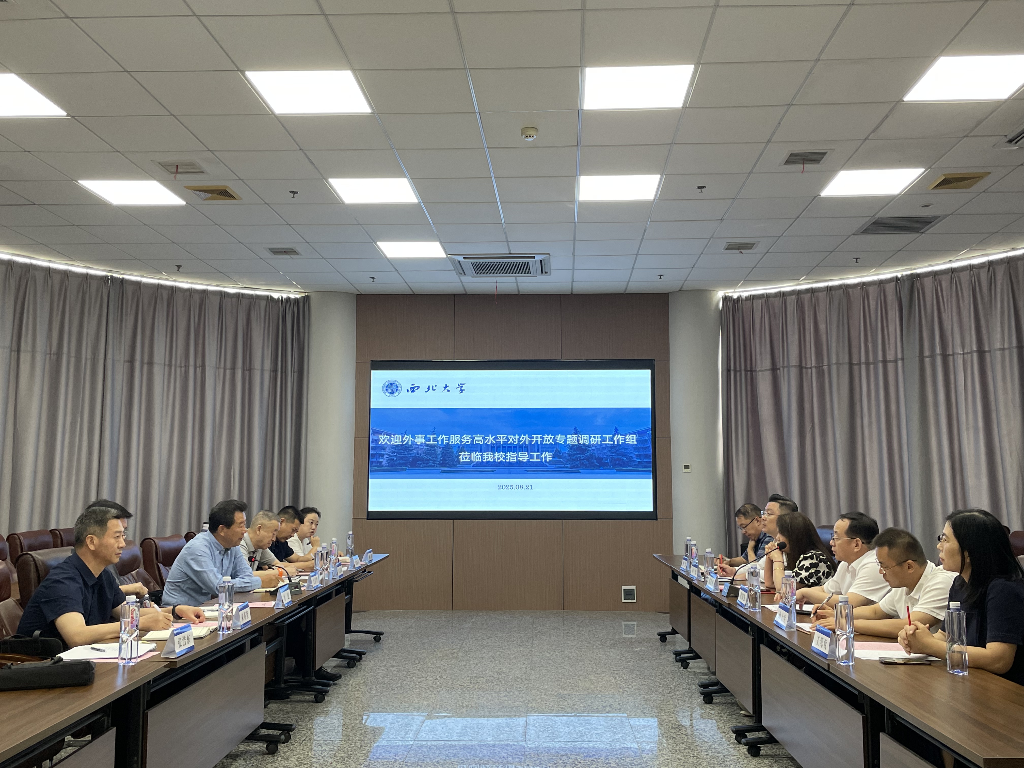 8 月 21 日,陕西省人大常委会委员、民宗侨外工委主任文引学一行来校就外事工作服务高水平对外开放开展专题调研。我校党委常委、副校长范代娣陪同调研并参与座谈,陕西省外办及我校统战部、国际合作部(国际教育学院)、科学技术处、丝绸之路考古合作研究中心相关代表陪同调研并参会。