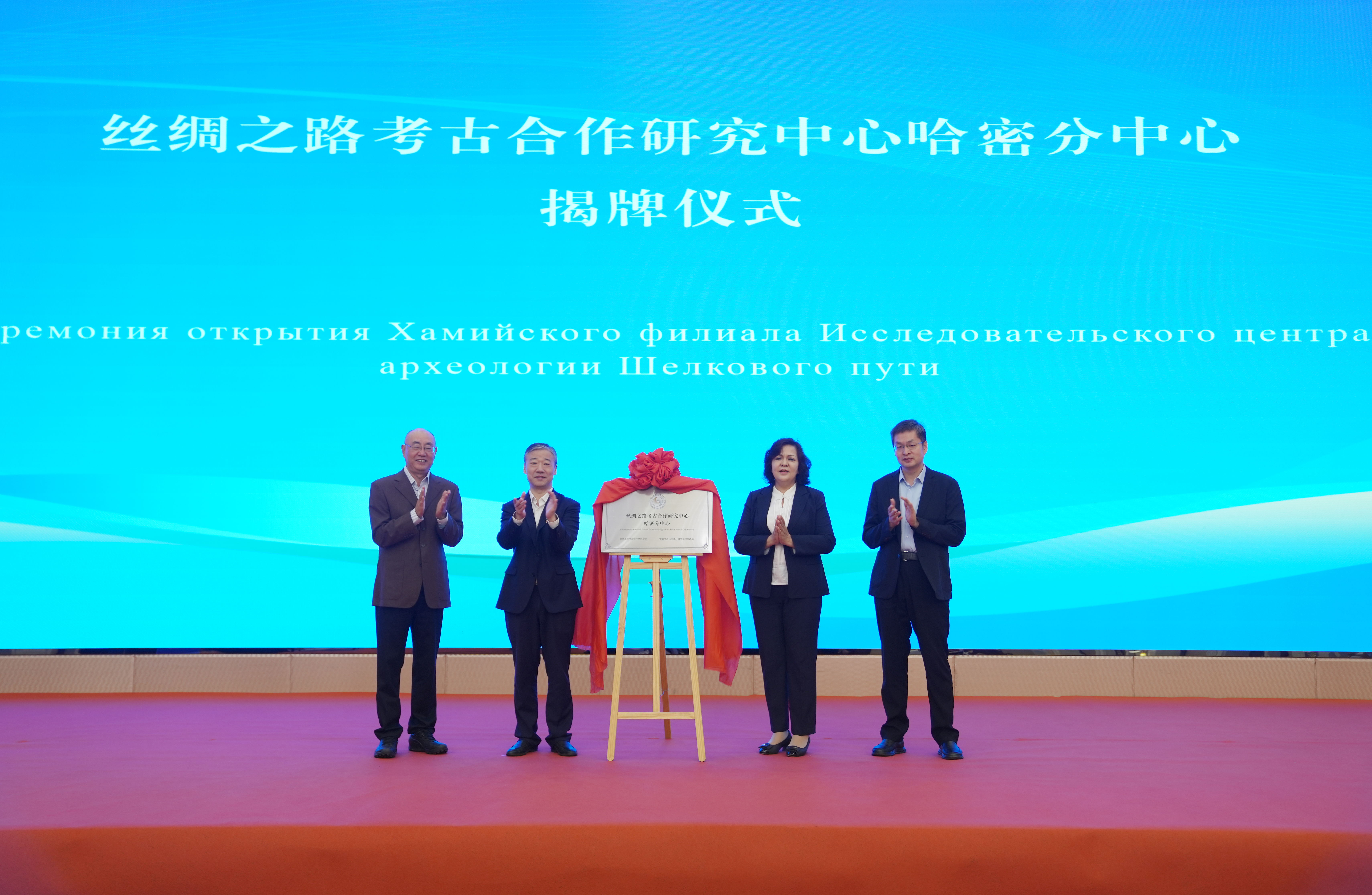 蒋林、赵荣与吾尔叶提·吾守尔、党志豪共同为哈密分中心揭牌。王建新和周美玲被聘为分中心主任,新疆维吾尔自治区文物考古研究所研究馆员、我校特聘教授于建军被聘为分中心学术委员会主任。