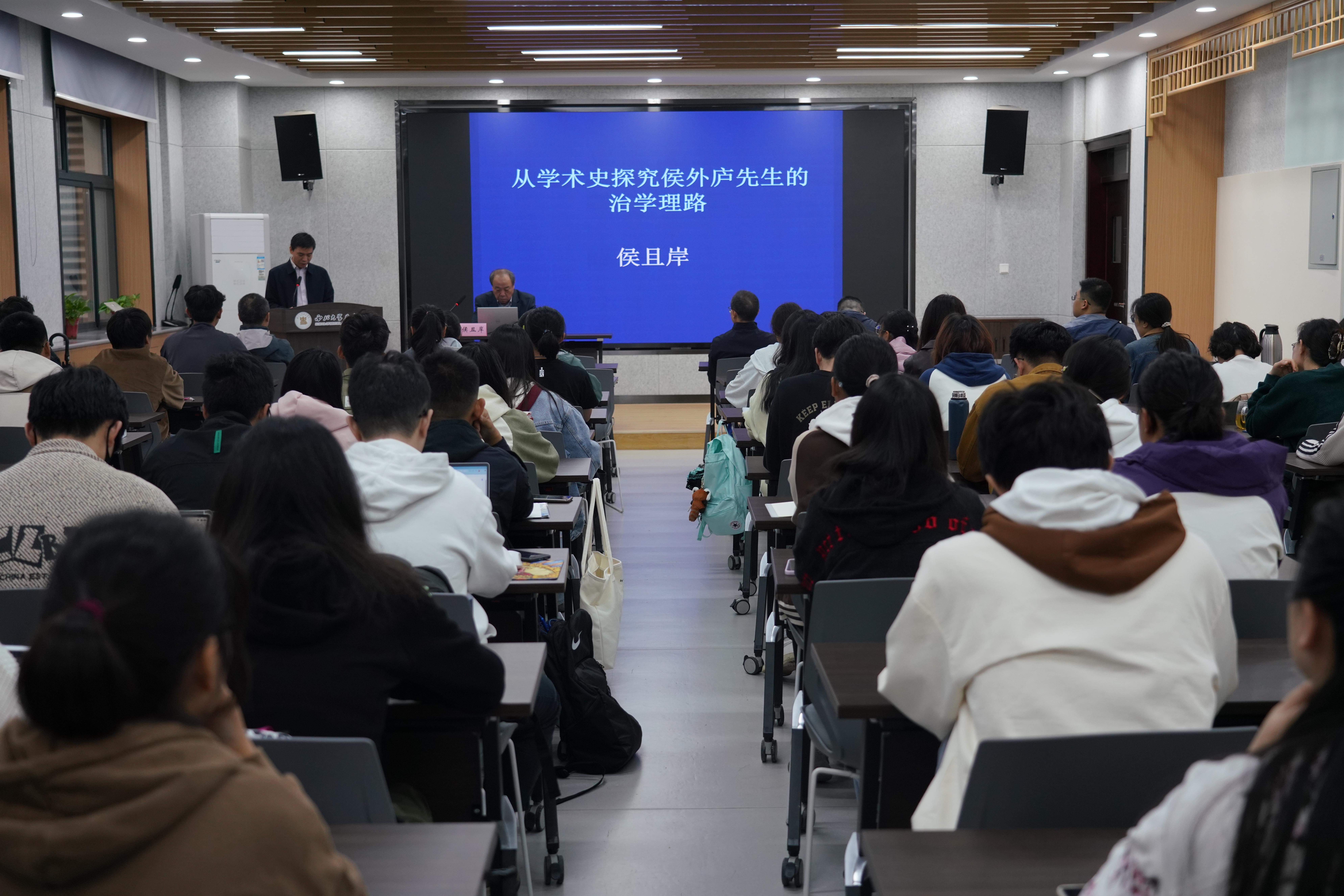 侯且岸教授以张岂之、李学勤等史学家对侯外庐先生的学术追忆为切入点,系统梳理了侯外庐先生的治学理路,并高度概括了侯外庐先生的治学特点。他指出侯外庐通过翻译《资本论》,确立了唯物史观。侯外庐强调社会史和思想史研究的有机结合、相互依存。从社会史研究到思想史研究,再到学术史研究的新研究理路,真正体现了侯外庐治学的大历史观。侯且岸教授特别强调侯外庐先生治学中展现的高度理论自觉,积极追求马克思主义史学中国化、民族化等宝贵的学术特点和品格的重要影响,并从侯外庐的未竟之业中启迪青年学子接续研究。本次讲座对于传承发展侯外庐等史学家的学术遗产,启迪学术门径,具有重要启示。