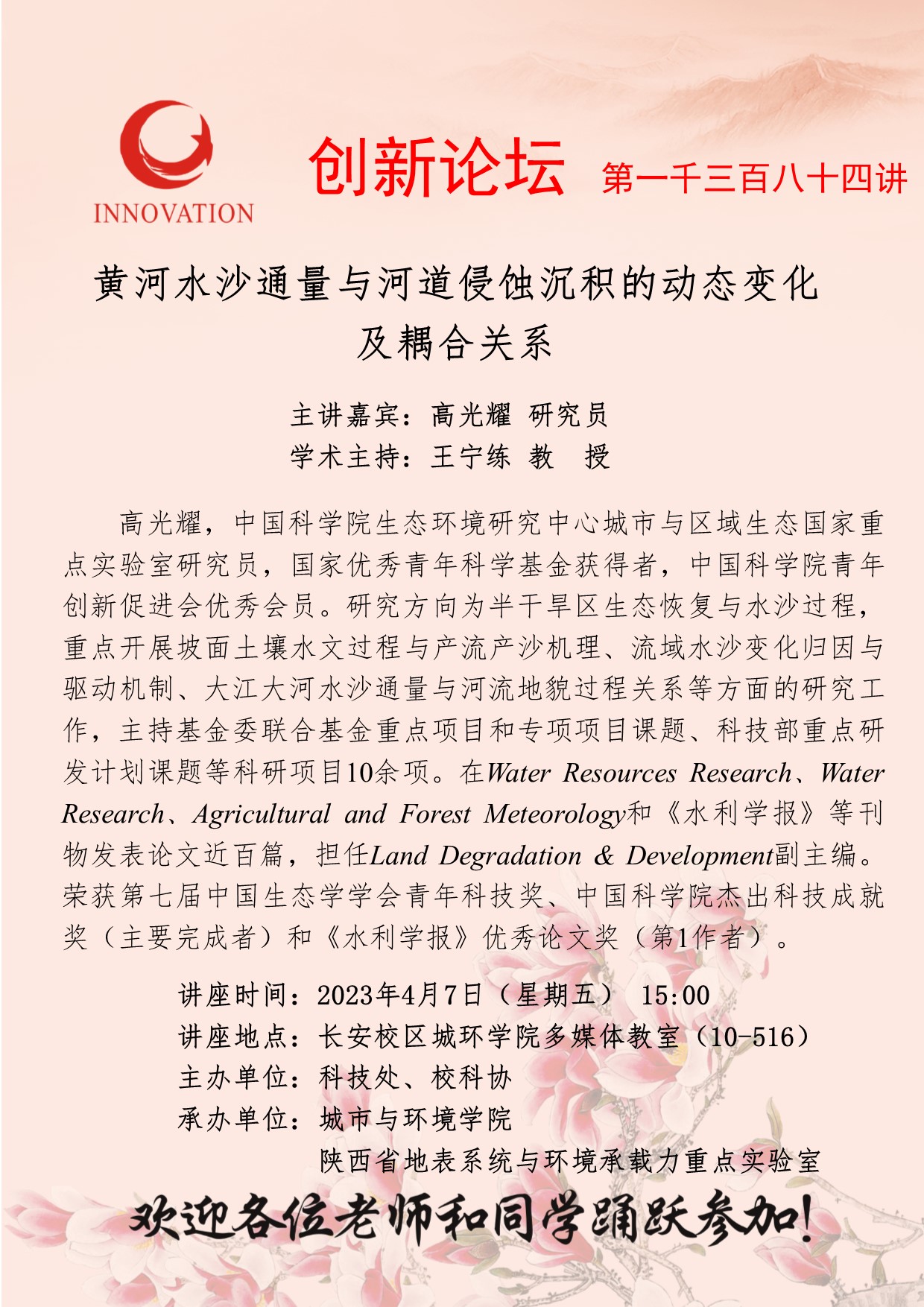 高光耀 研究员 西北大学创新论坛第一千三百八十四讲:黄河水沙通量与河道侵蚀沉积的动态变化及耦合关系 讲座时间 2023年4月7日(星期五) 15:00 讲座地点 长安校区城环学院多媒体教室(10-516) 讲座人介绍 高光耀 研究员 讲座内容