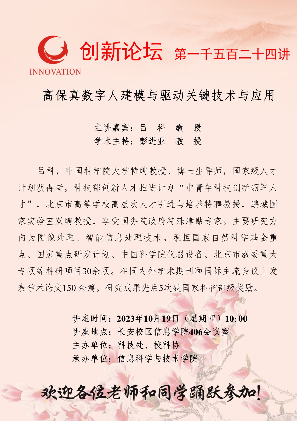 吕科 教 授 西北大学创新论坛第一千五百二十四讲:高保真数字人建模与驱动关键技术与应用 讲座时间 2023年10月19日(星期四)10:00 讲座地点 长安校区信息学院406会议室 讲座人介绍 吕科 教 授 讲座内容