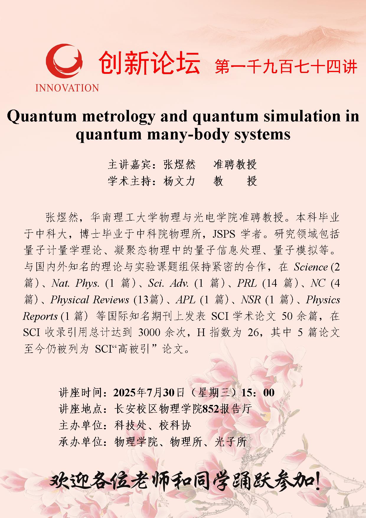 张煜然 准聘教授 西北大学创新论坛第一千九百七十四讲:Quantum metrology and quantum simulation in quantum many-body systems 讲座时间 2025年7月30日(星期三)15:00 讲座地点 长安校区物理学院852报告厅 讲座人介绍 张煜然 准聘教授 讲座内容