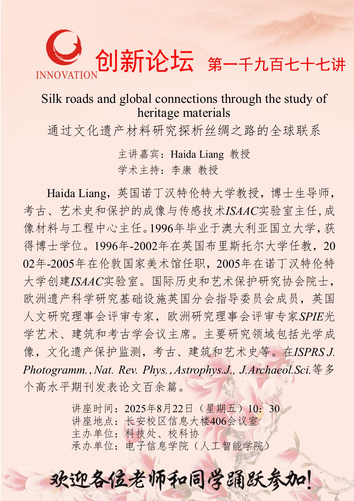 梁海达 教授 西北大学创新论坛第一千九百七十七讲:Silk roads and global connections through the study of heritage materials 讲座时间 2025年8月22日(星期五)10:30 讲座地点 长安校区信息大楼406会议室 讲座人介绍 梁海达 教授 讲座内容