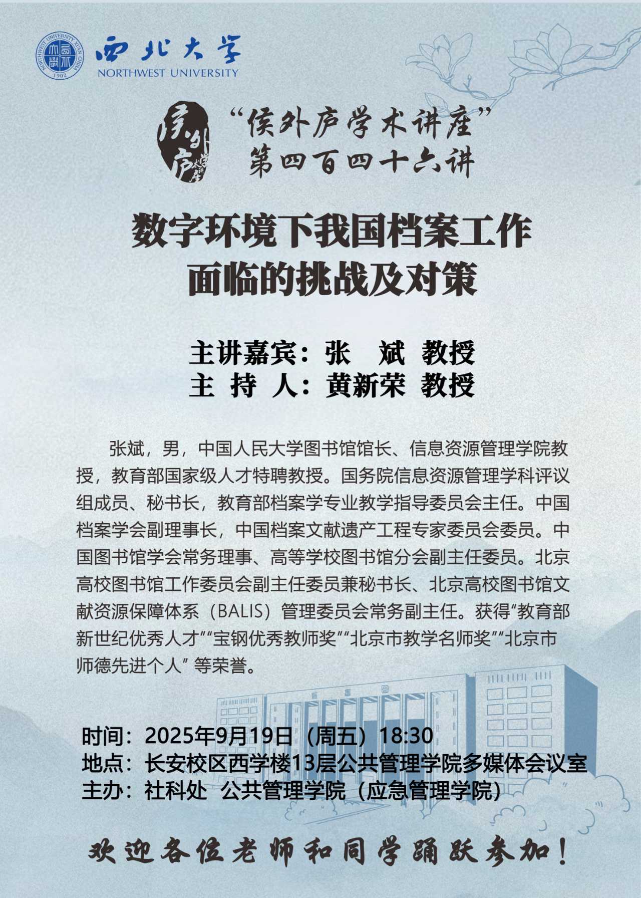 张斌 教授 “侯外庐学术讲座”第四百四十六讲:数字环境下我国档案工作面临的挑战及对策 讲座时间 2025年9月19日 (周五)18:30 讲座地点 西学楼13层公共管理学院多媒体会议室 讲座人介绍 张斌 教授 讲座内容