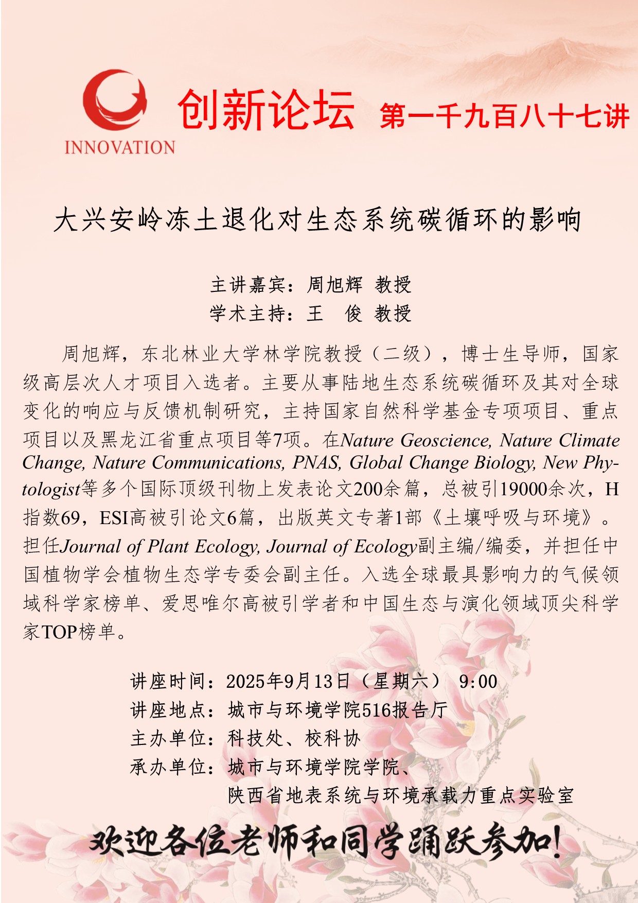 周旭辉 教授 西北大学创新论坛第一千九百八十七讲:大兴安岭冻土退化对生态系统碳循环的影响 讲座时间 2025年9月13日(星期六) 讲座地点 城市与环境学院516报告厅 讲座人介绍 周旭辉 教授 讲座内容