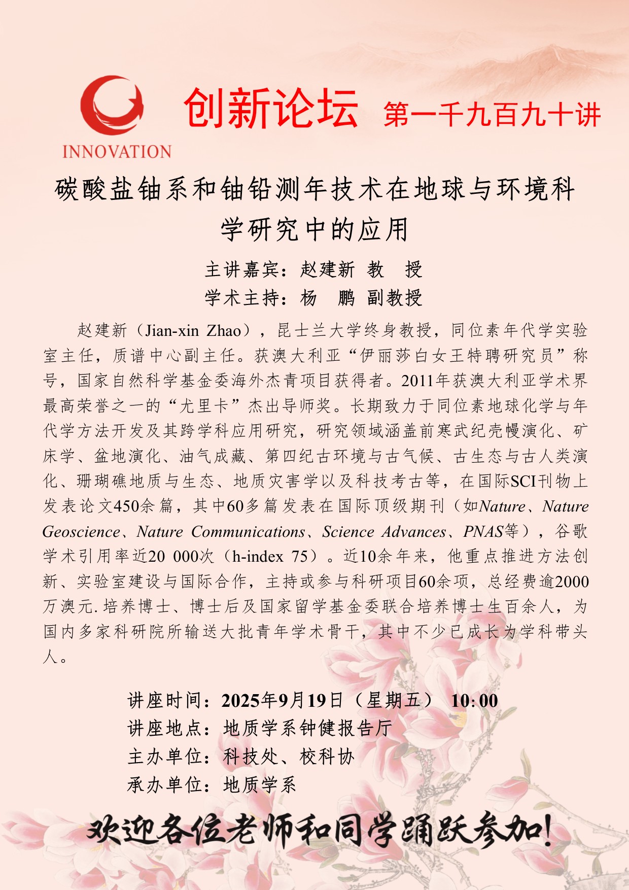 赵建新 教授 西北大学创新论坛第一千九百九十讲:碳酸盐铀系和铀铅测年技术在地球与环境科学研究中的应用 讲座时间 2025年9月19日(星期五) 10:00 讲座地点 地质学系钟健报告厅 讲座人介绍 赵建新 教授 讲座内容