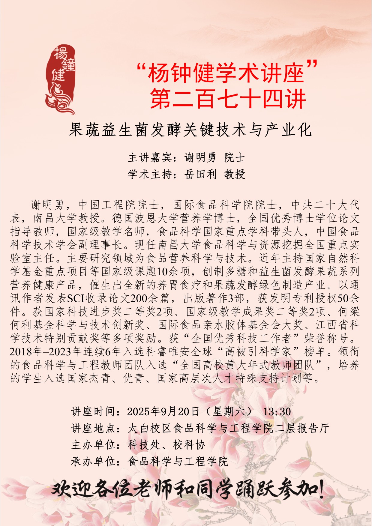 谢明勇 院士 “杨钟健学术讲座”第二百七十四讲:果蔬益生菌发酵关键技术与产业化 讲座时间 2025年9月20日(星期六) 13:30 讲座地点 太白校区食品科学与工程学院二层报告厅 讲座人介绍 谢明勇 院士 讲座内容
