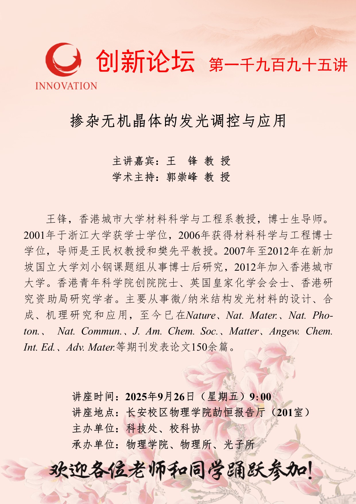 王锋 教授 西北大学创新论坛第一千九百九十五讲:掺杂无机晶体的发光调控与应用 讲座时间 2025年9月26日(星期五)9:00 讲座地点 长安校区物理学院劼恒报告厅(201室) 讲座人介绍 王锋 教授 讲座内容