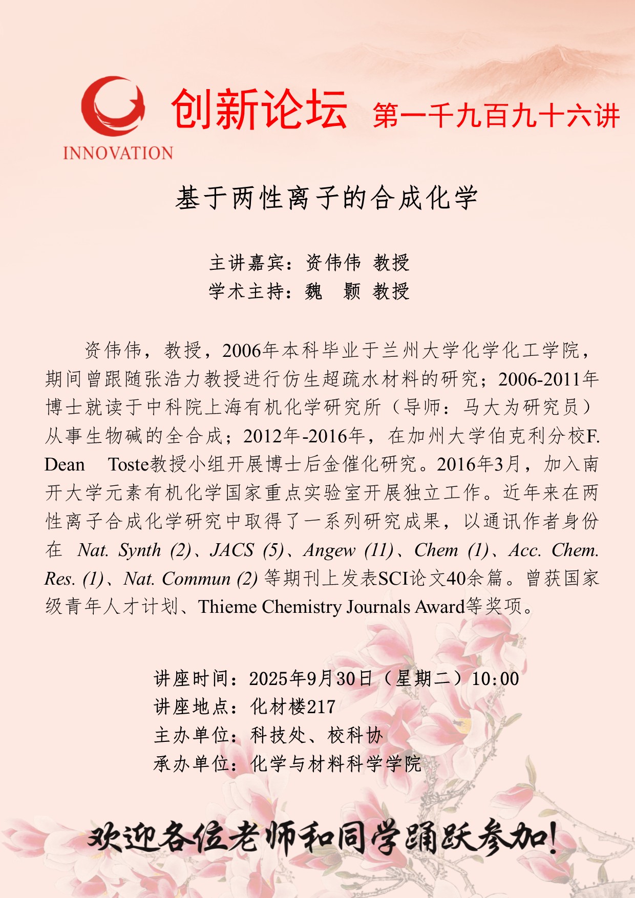 西北大学创新论坛第一千九百九十六讲: 基于两性离子的合成化学