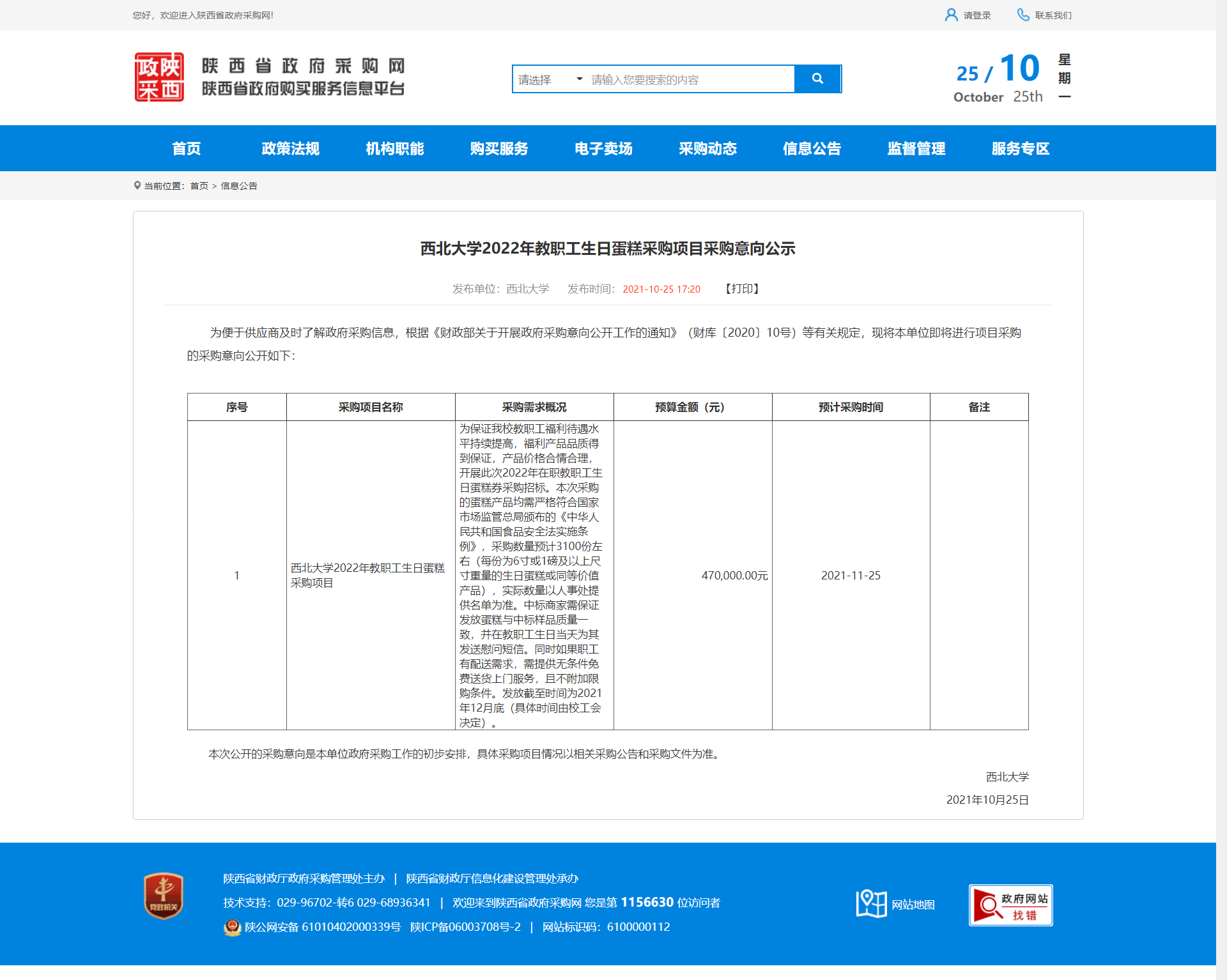 西北大学2022年教职工生日蛋糕采购项目采购意向公示 作者: 编辑:薛利娟 时间:2021-10-25 原公告地址:http://www.ccgp-shaanxi.gov.cn/notice/noticeDetail.do?noticeguid=8a85be337c20d0b4017cb6bfc9ae33ff