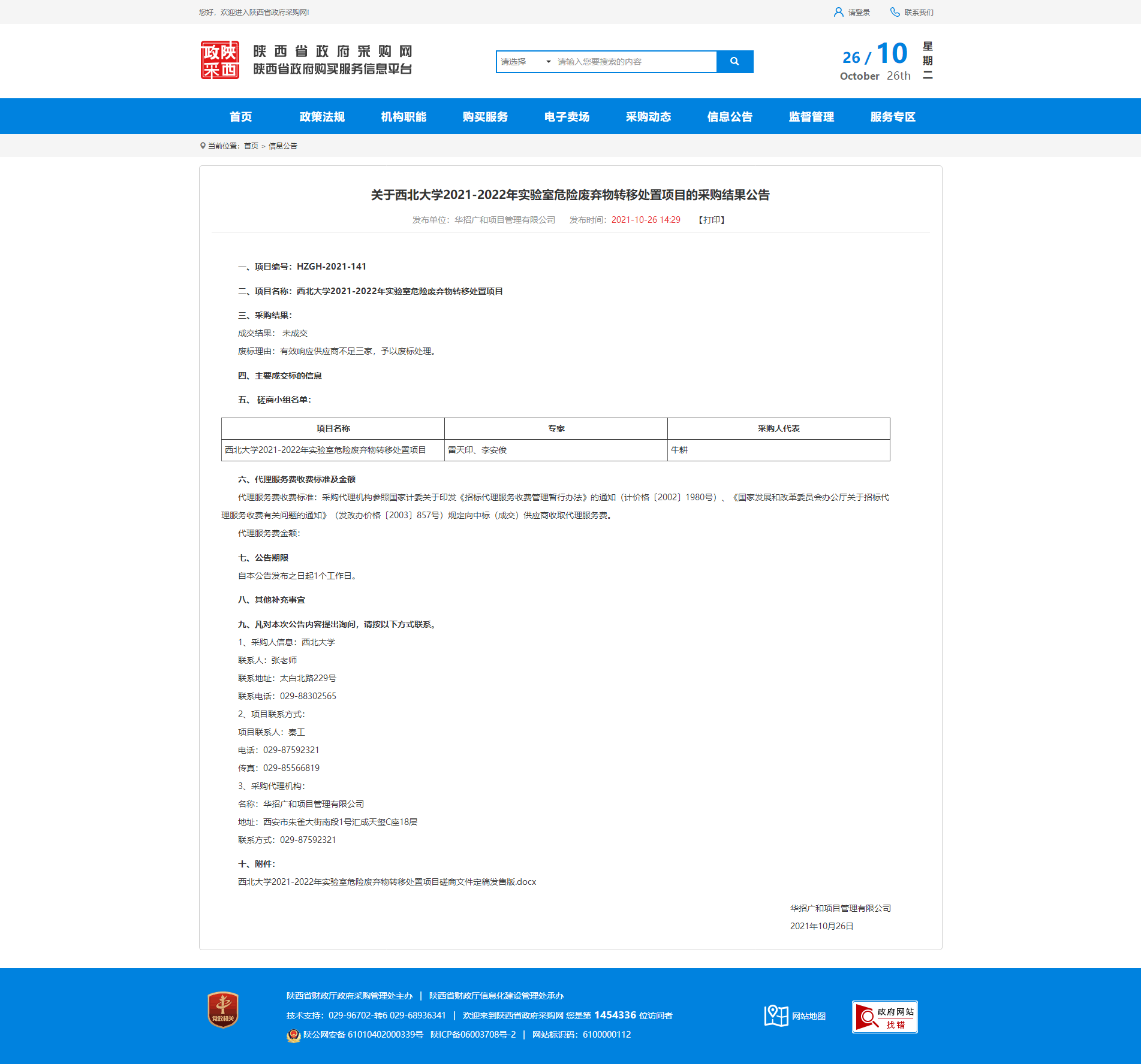 关于西北大学2021-2022年实验室危险废弃物转移处置项目的采购结果公告