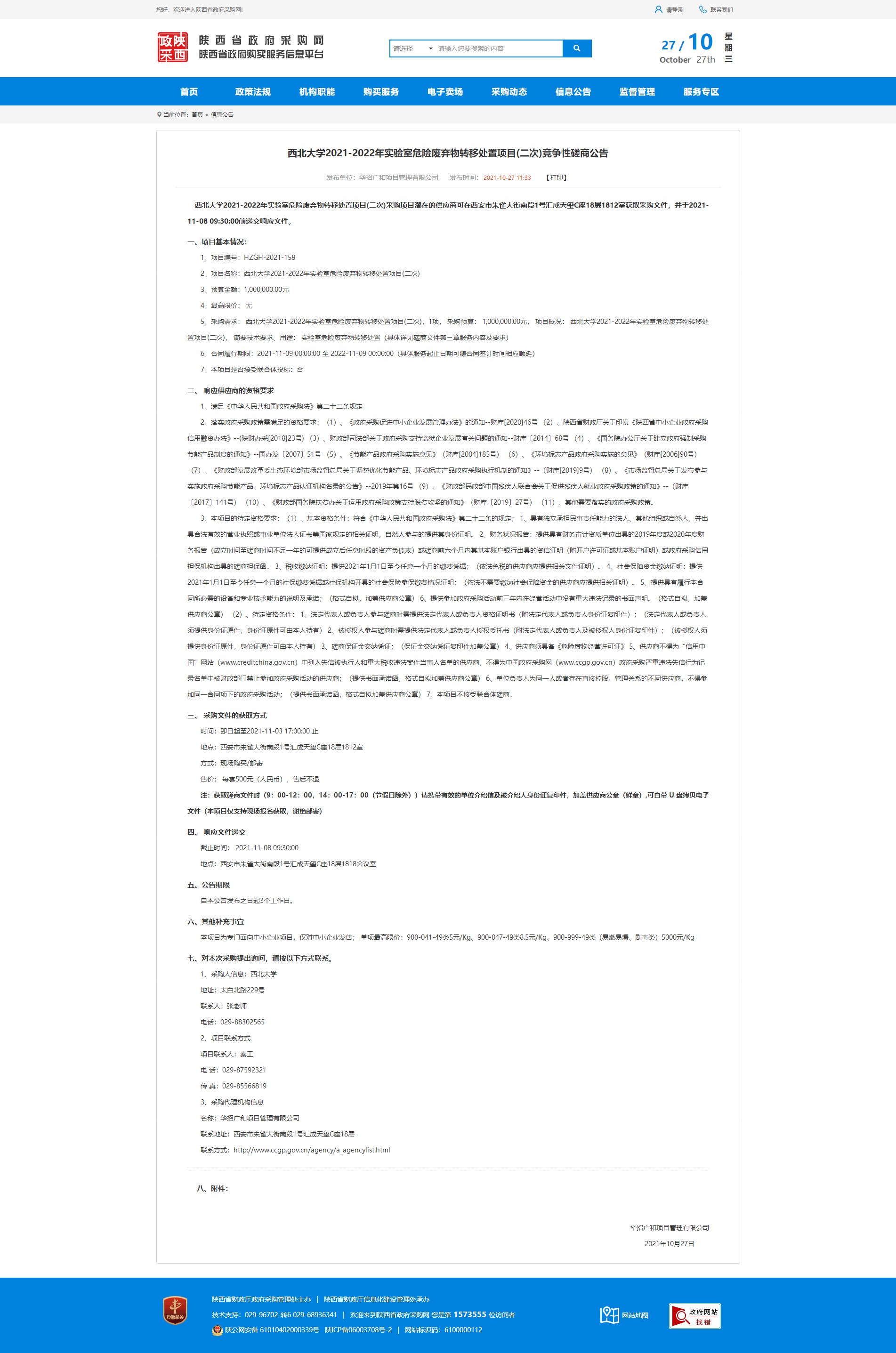 西北大学2021-2022年实验室危险废弃物转移处置项目(二次)竞争性磋商公告