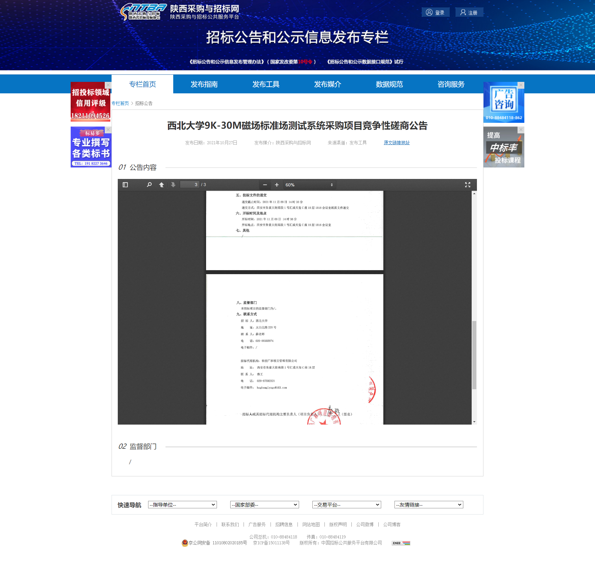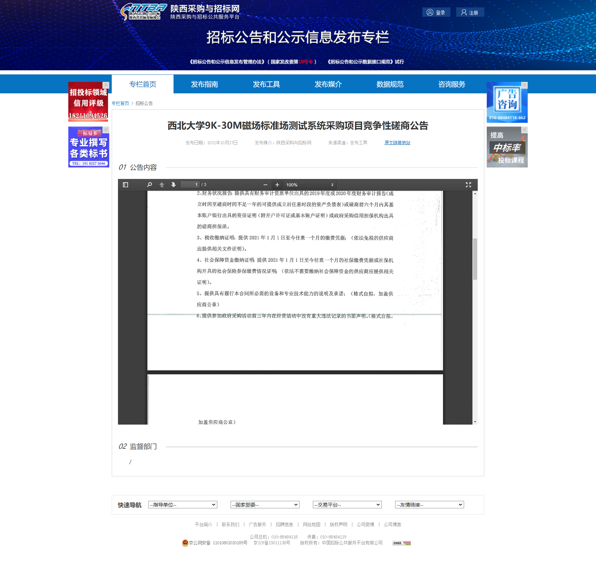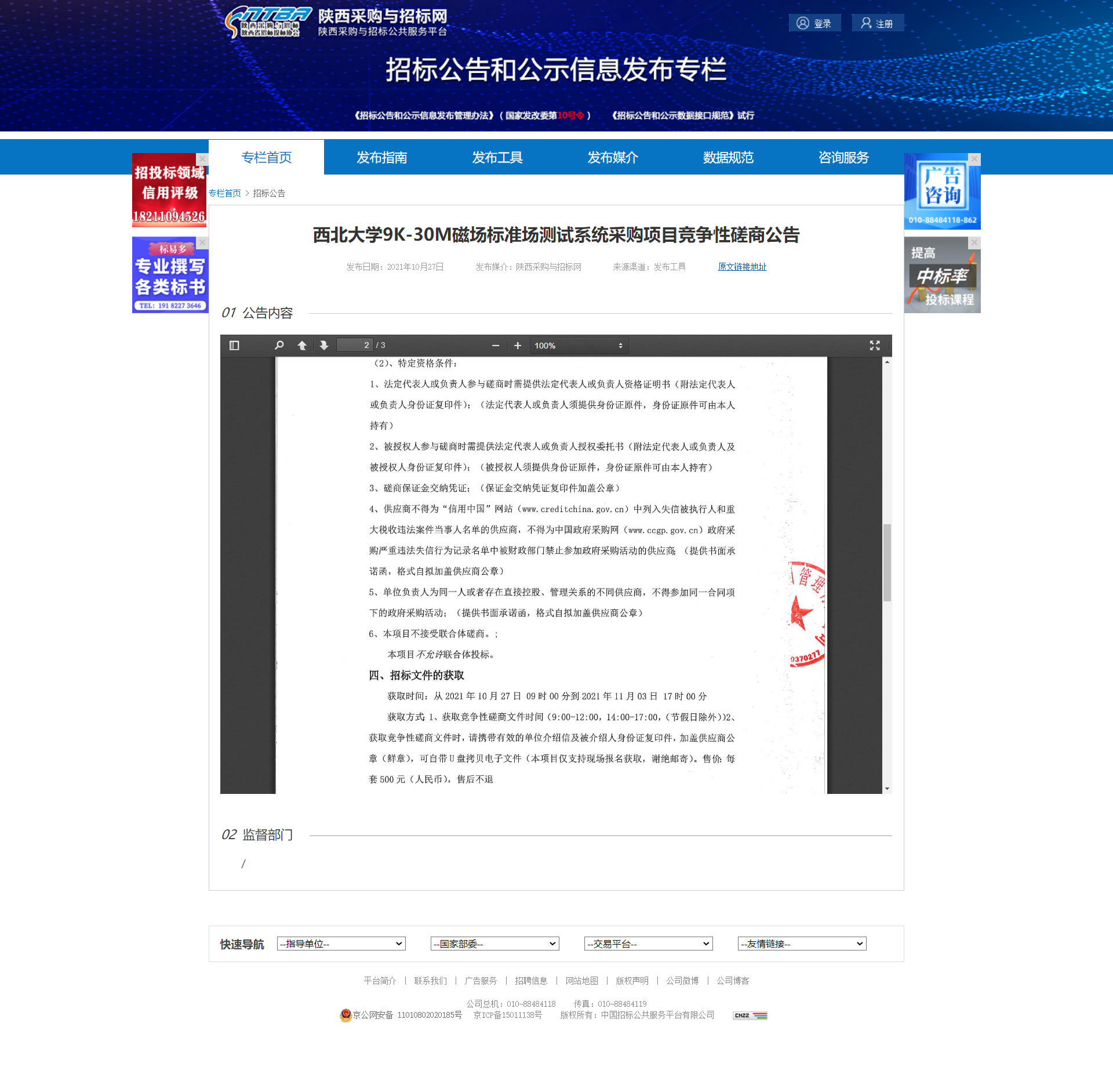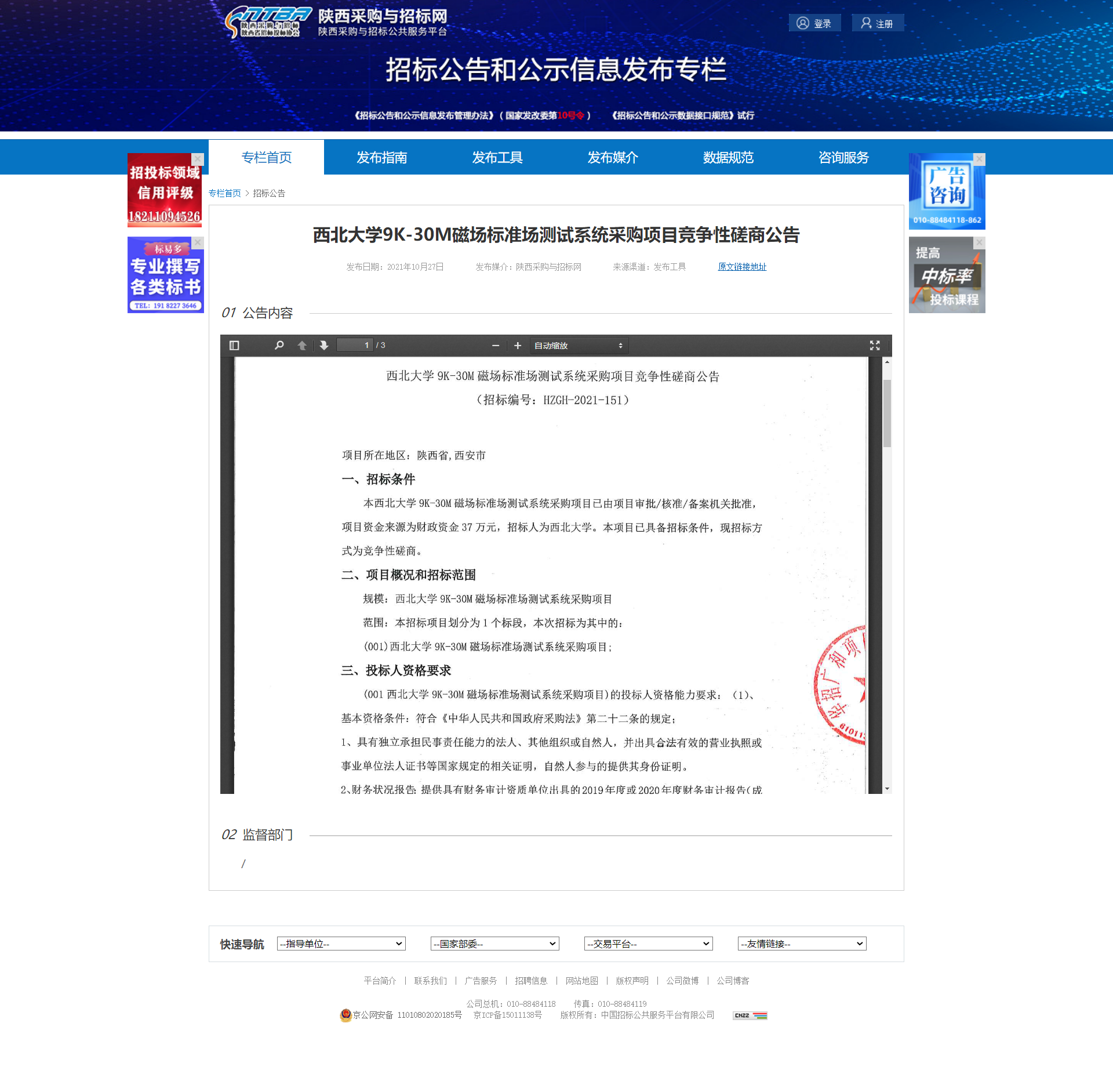 西北大学9K-30M磁场标准场测试系统采购项目竞争性磋商公告 作者: 编辑:薛利娟 时间:2021-10-27 原公告地址:http://bulletin.sntba.com/biddingBulletin/2021-10-27/357751.html