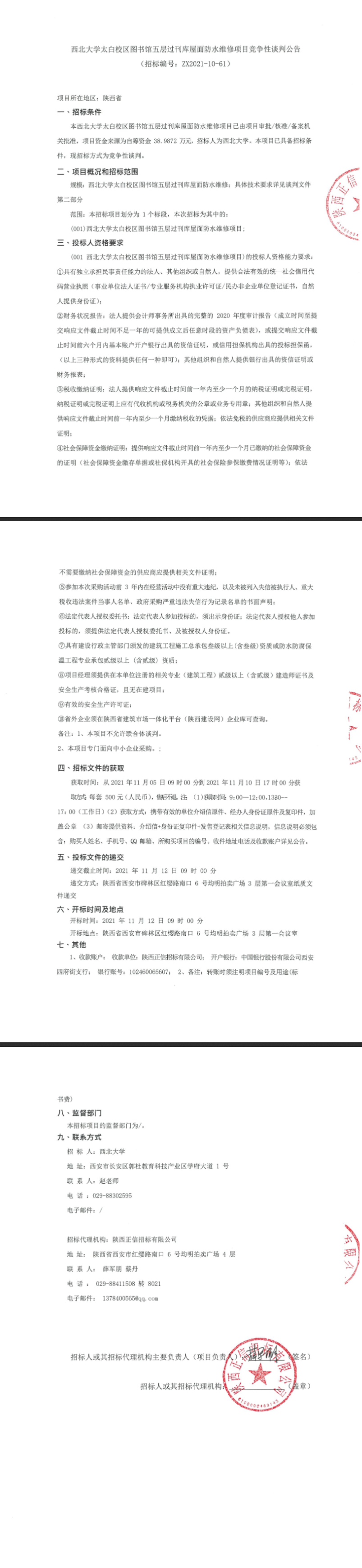 西北大学长安校区教学楼屋面防水维修项目竞争性谈判公告