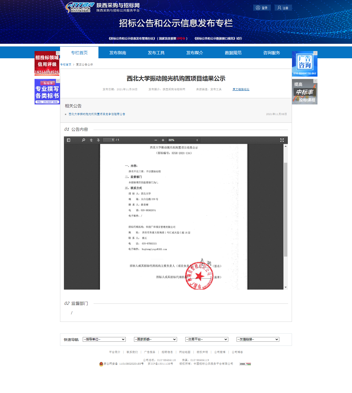 西北大学振动抛光机购置项目结果公示 作者: 编辑:薛利娟 时间:2021-11-08 原公告网址:http://bulletin.sntba.com/changeBulletin/2021-11-08/361693.html