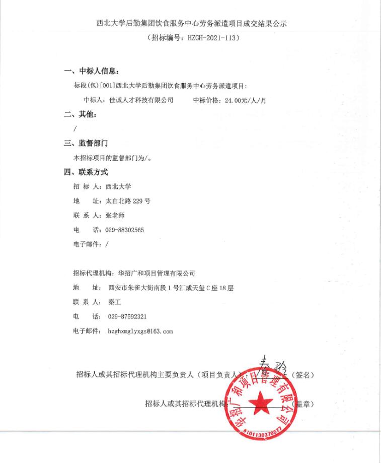 关于西北大学后勤集团饮食服务中心劳务派遣项目成交结果公告