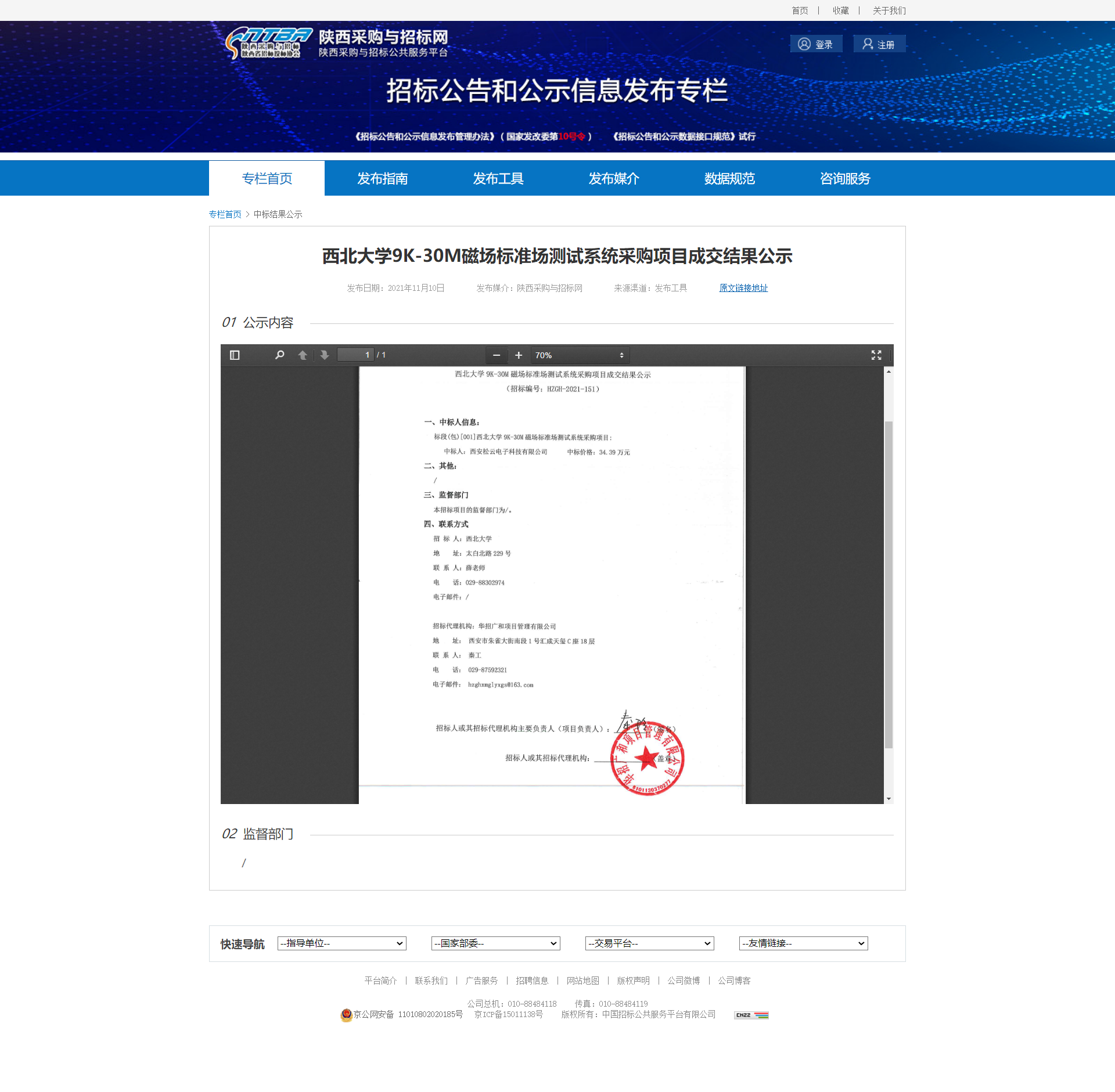 西北大学9K-30M磁场标准场测试系统采购项目成交结果公示 作者: 编辑:薛利娟 时间:2021-11-11 原公告网址:http://bulletin.sntba.com/resultBulletin/2021-11-10/362788.html