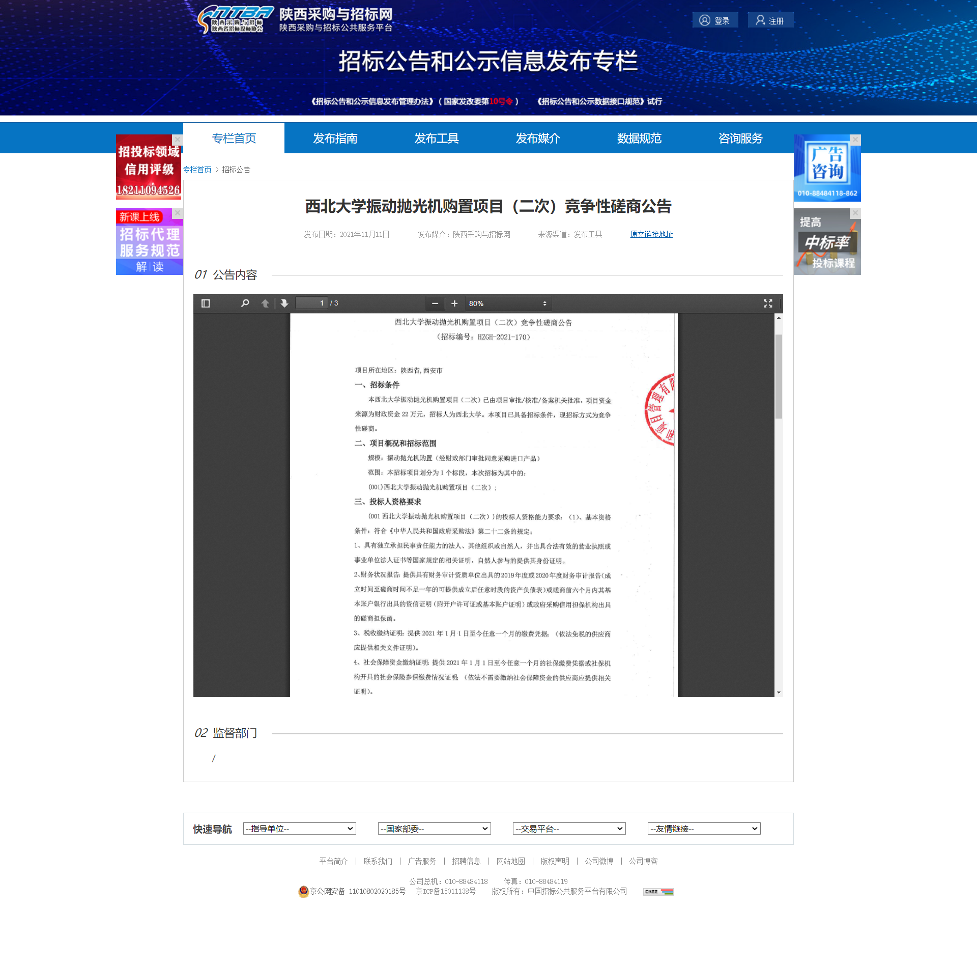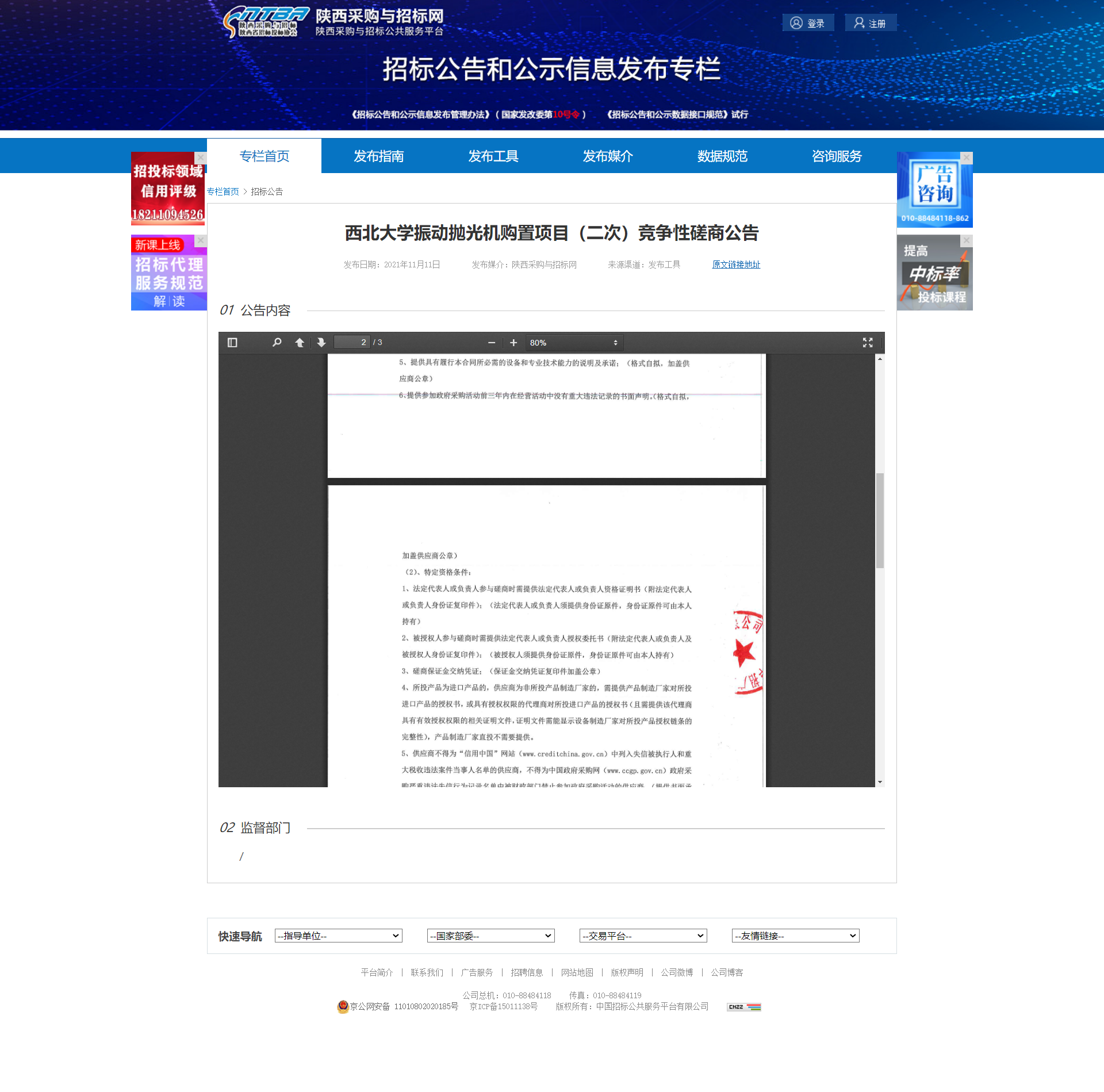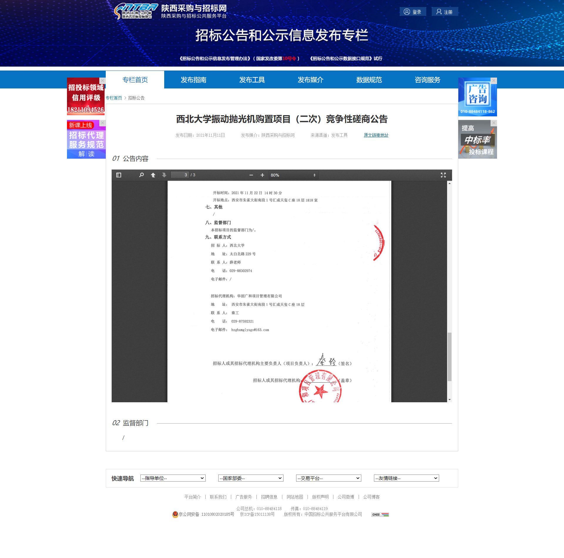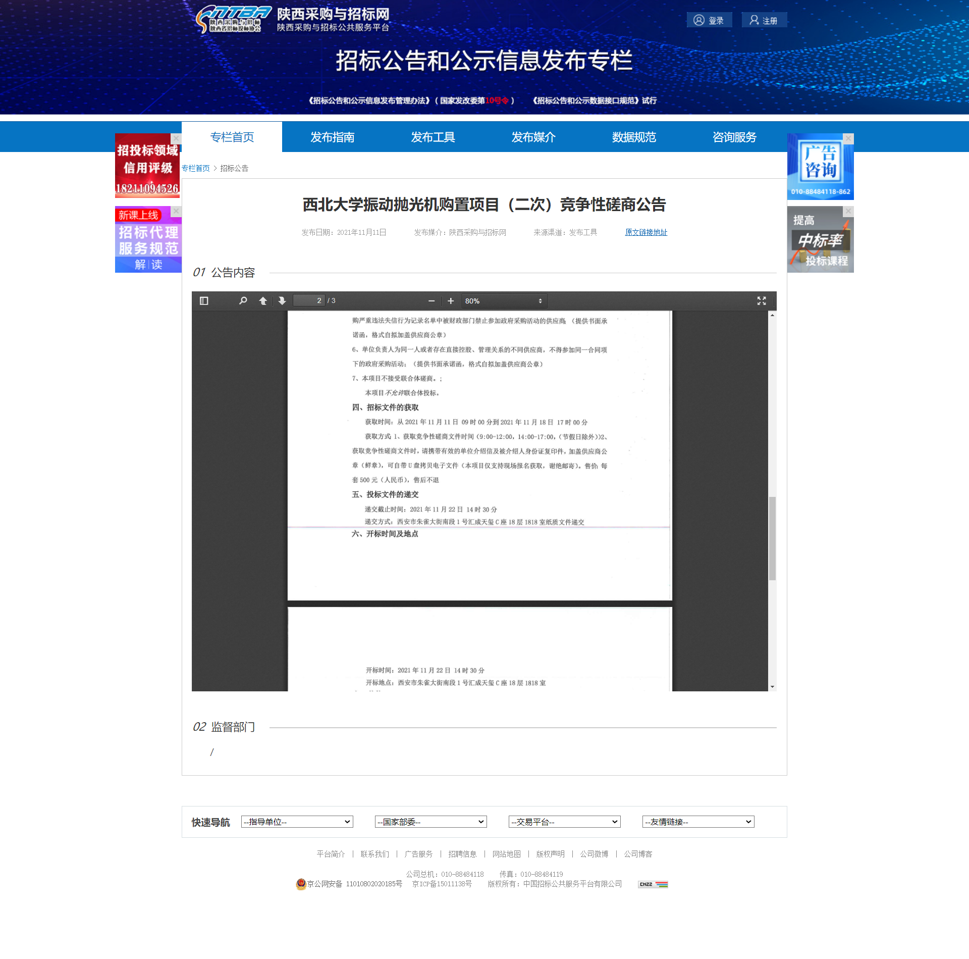 西北大学振动抛光机购置项目(二次)竞争性磋商公告 作者: 编辑:薛利娟 时间:2021-11-11 原公告网址:http://bulletin.sntba.com/biddingBulletin/2021-11-11/363026.html