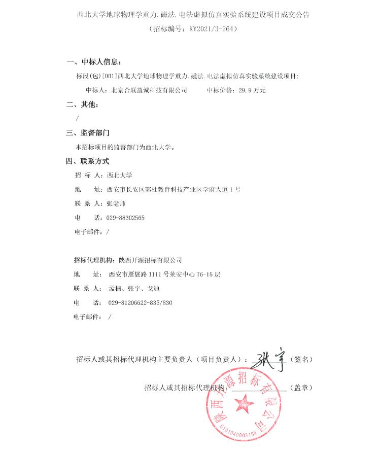 关于西北大学地球物理学重力.磁法.电法虚拟仿真实验系统建设项目成交结果公告