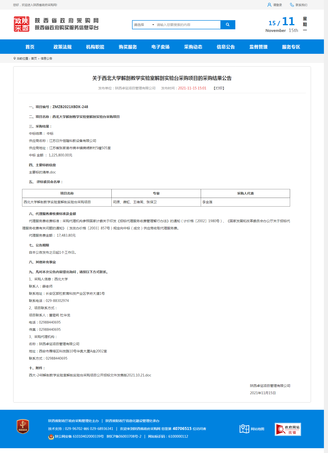 关于西北大学解剖教学实验室解剖实验台采购项目的采购结果公告 作者: 编辑:薛利娟 时间:2021-11-15 原公告网址:http://www.ccgp-shaanxi.gov.cn/notice/noticeDetail.do?noticeguid=8a85be347cefc0a5017d2265933b409c