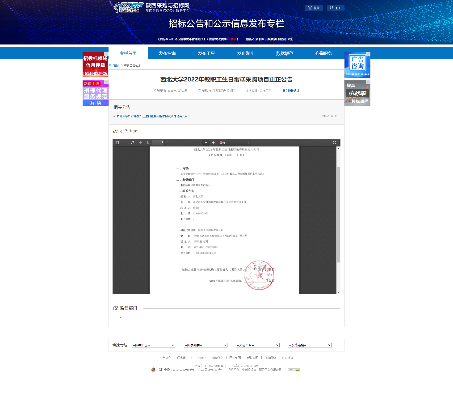 西北大学2022年教职工生日蛋糕采购项目更正公告 作者: 编辑:薛利娟 时间:2021-11-24 原公告网址:http://bulletin.sntba.com/changeBulletin/2021-11-22/366977.html