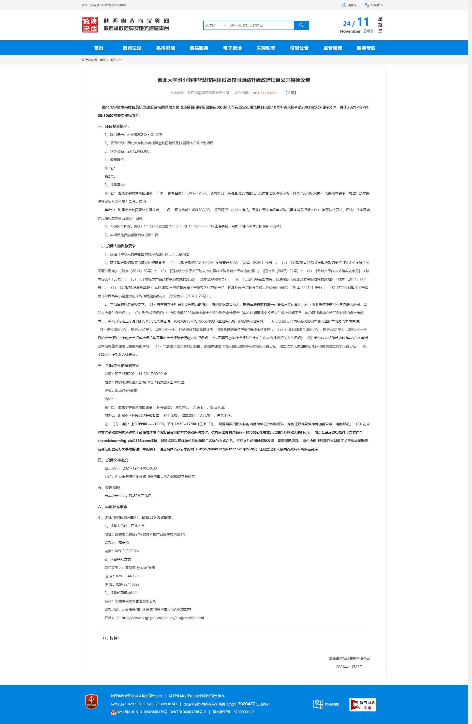 西北大学附小南楼智慧校园建设及校园网络升级改造项目公开招标公告 作者: 编辑:薛利娟 时间:2021-11-24 原公告网址:http://www.ccgp-shaanxi.gov.cn/notice/noticeDetail.do?noticeguid=8a85be347d2d6f8d017d4af0eb515dc6