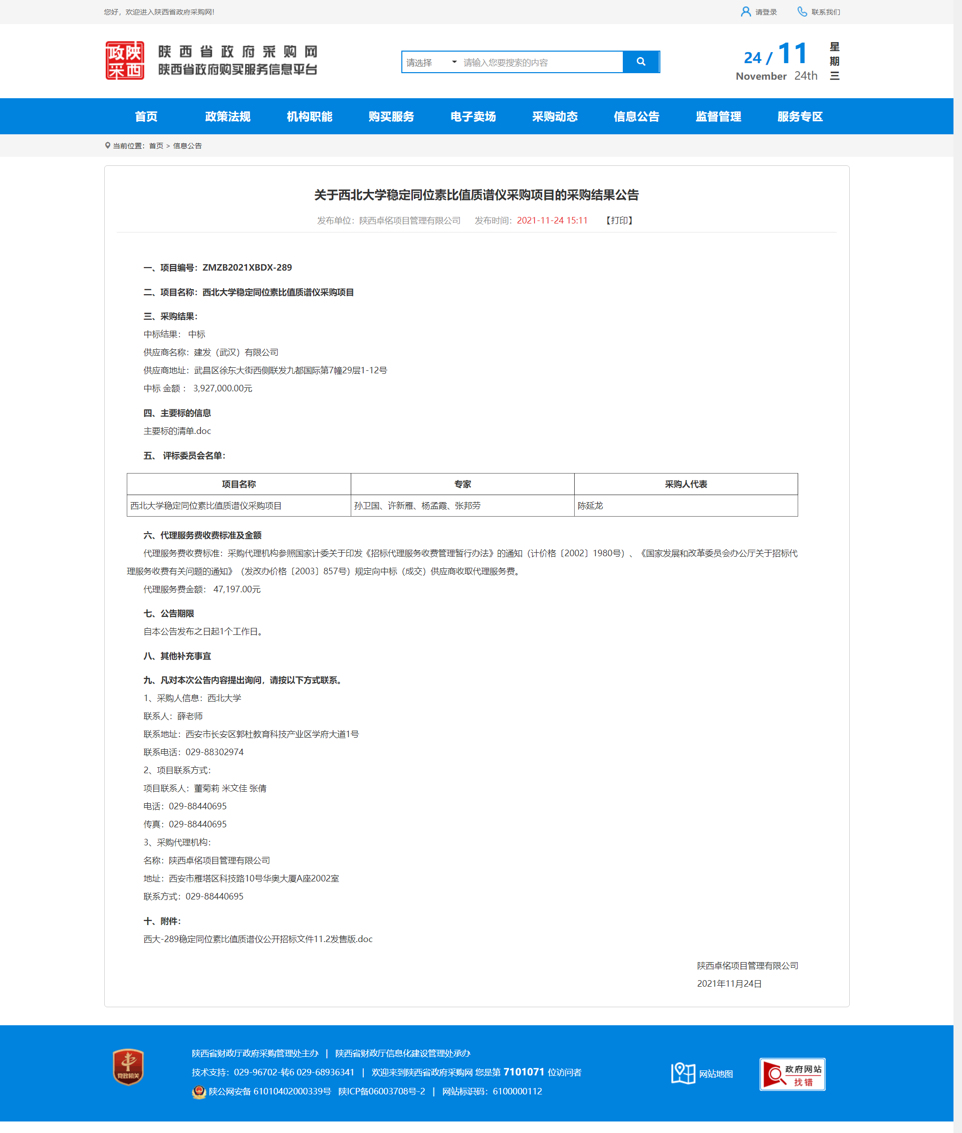 关于西北大学稳定同位素比值质谱仪采购项目的采购结果公告 作者: 编辑:薛利娟 时间:2021-11-24 原公告网址:http://www.ccgp-shaanxi.gov.cn/notice/noticeDetail.do?noticeguid=8a85be347d2d6f8d017d50c513e326e6