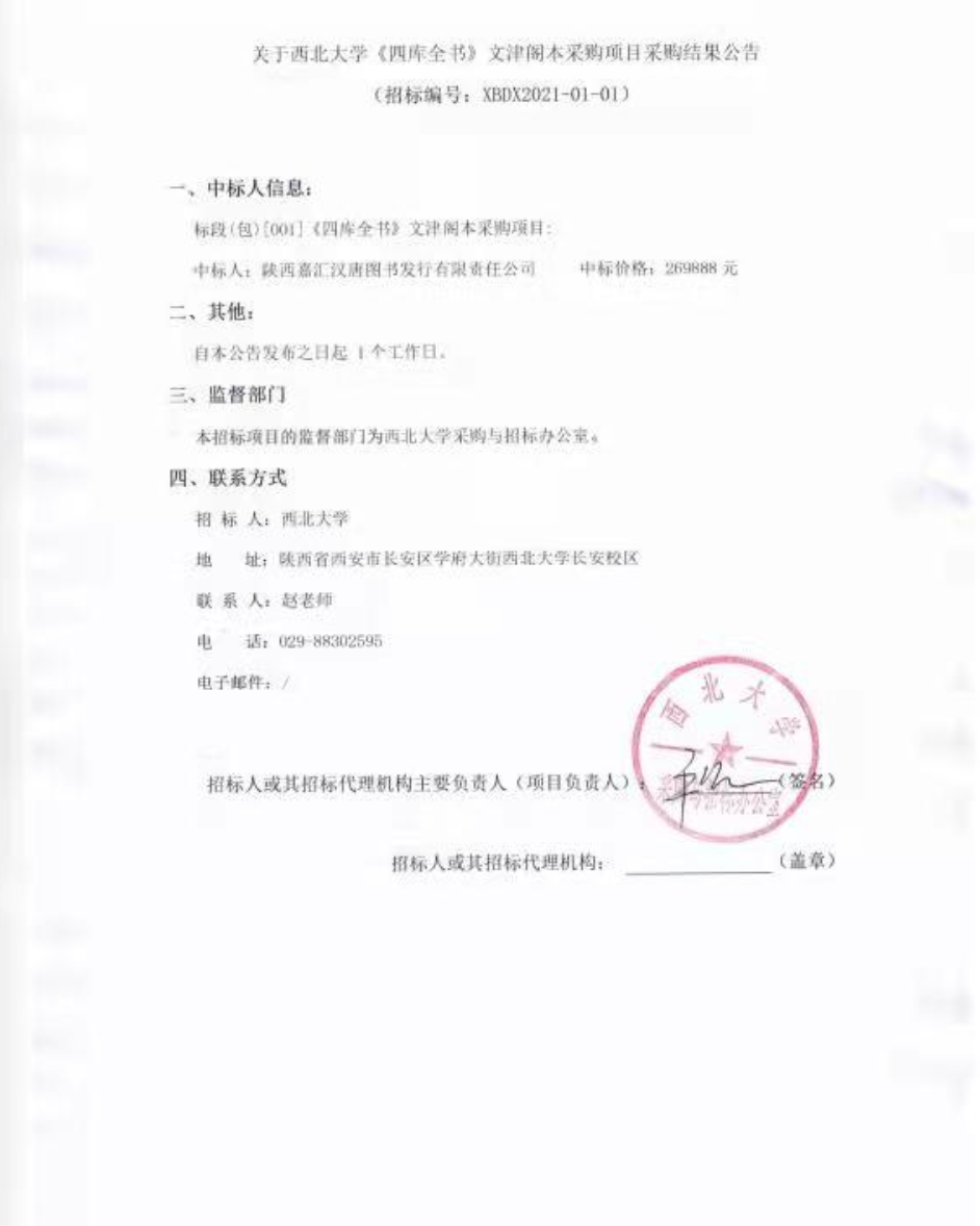 关于西北大学《四库全书》文津阁本采购项目成交结果公告