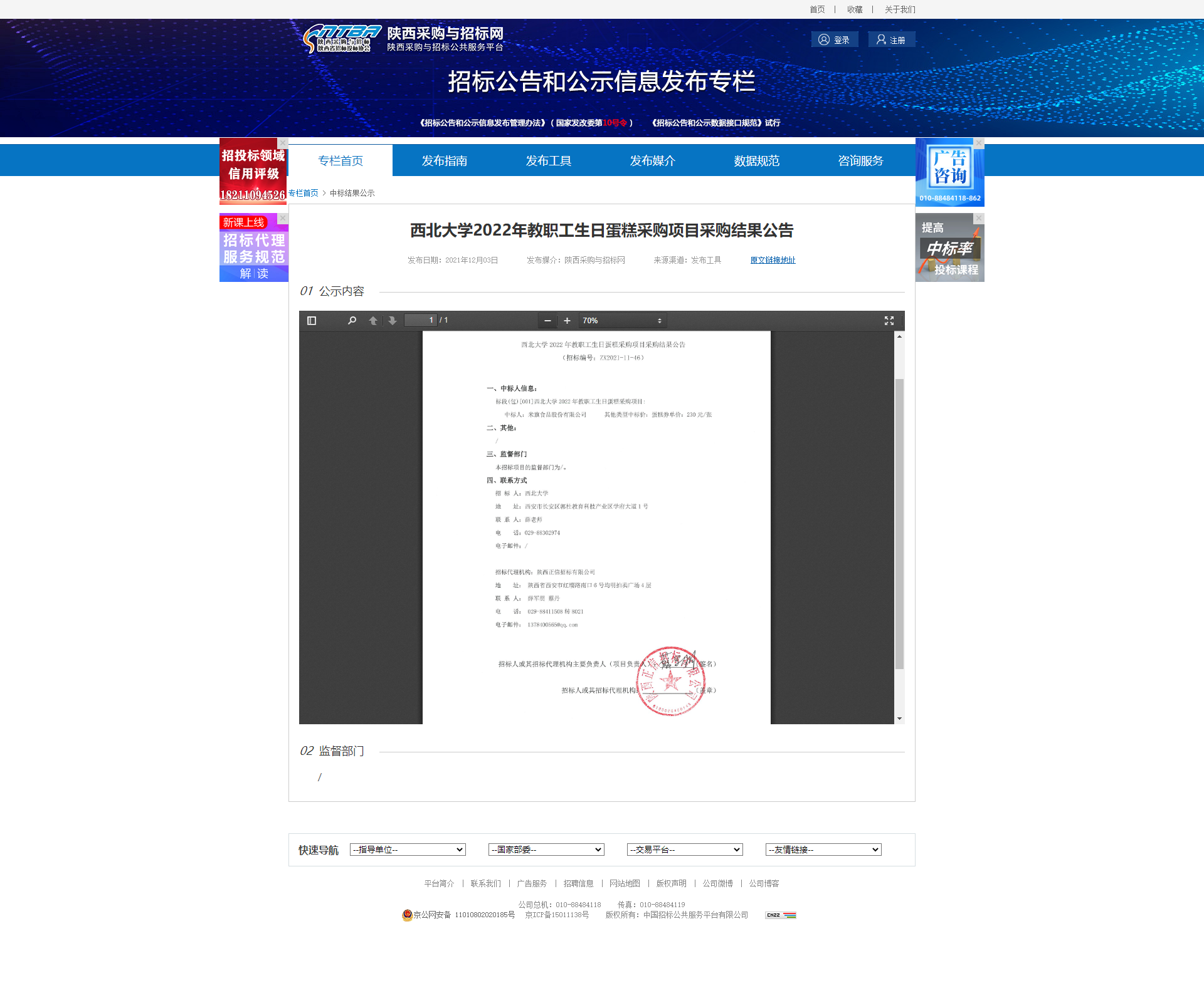 西北大学2022年教职工生日蛋糕采购项目采购结果公告 作者: 编辑:薛利娟 时间:2021-12-06 原公告网址:http://bulletin.sntba.com/resultBulletin/2021-12-03/371639.html