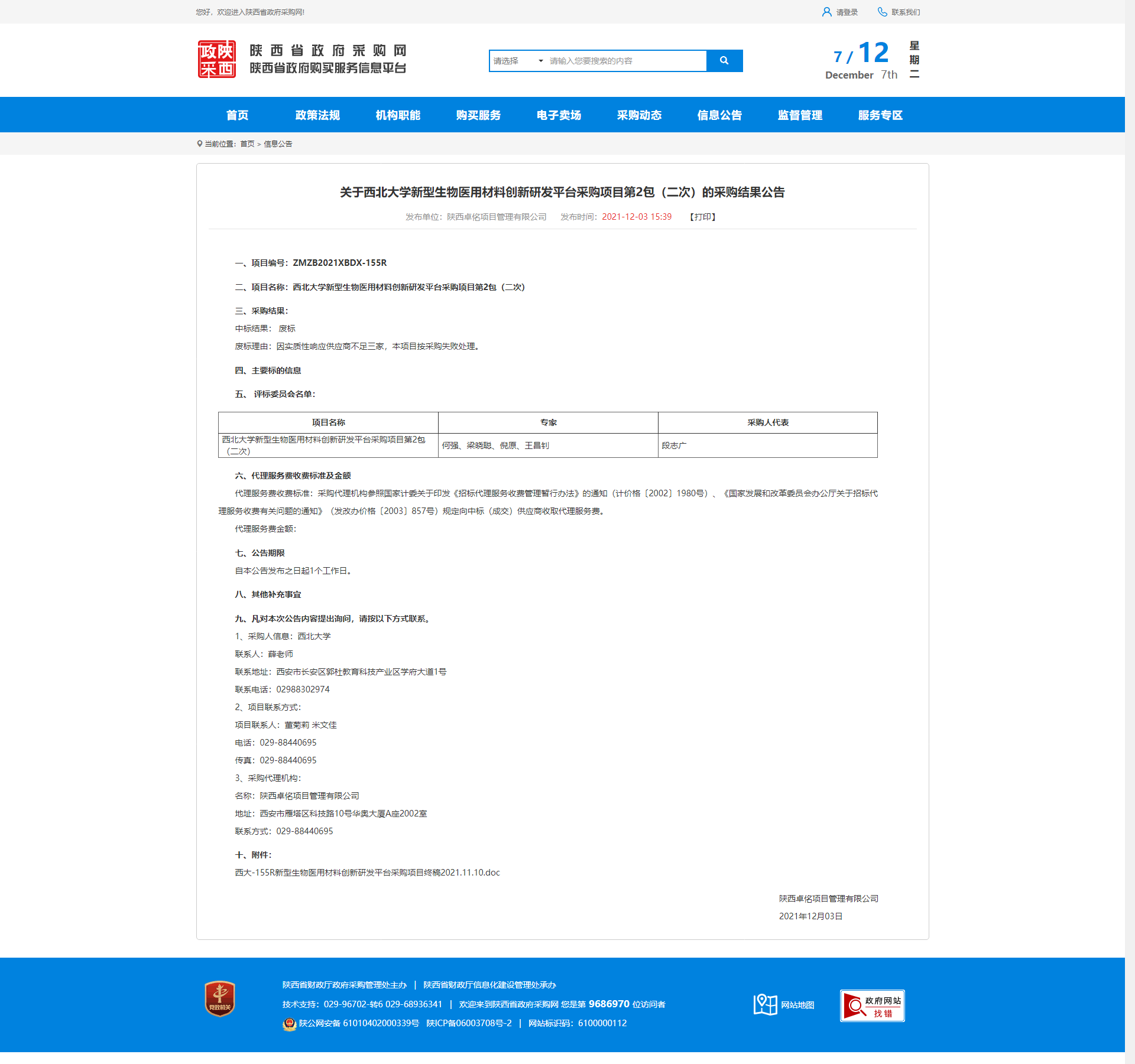关于西北大学新型生物医用材料创新研发平台采购项目第2包(二次)的采购结果公告 作者: 编辑:薛利娟 时间:2021-12-07 原公告链接:http://www.ccgp-shaanxi.gov.cn/notice/noticeDetail.do?noticeguid=8a85be347d6a75c8017d7f38c86a62bc
