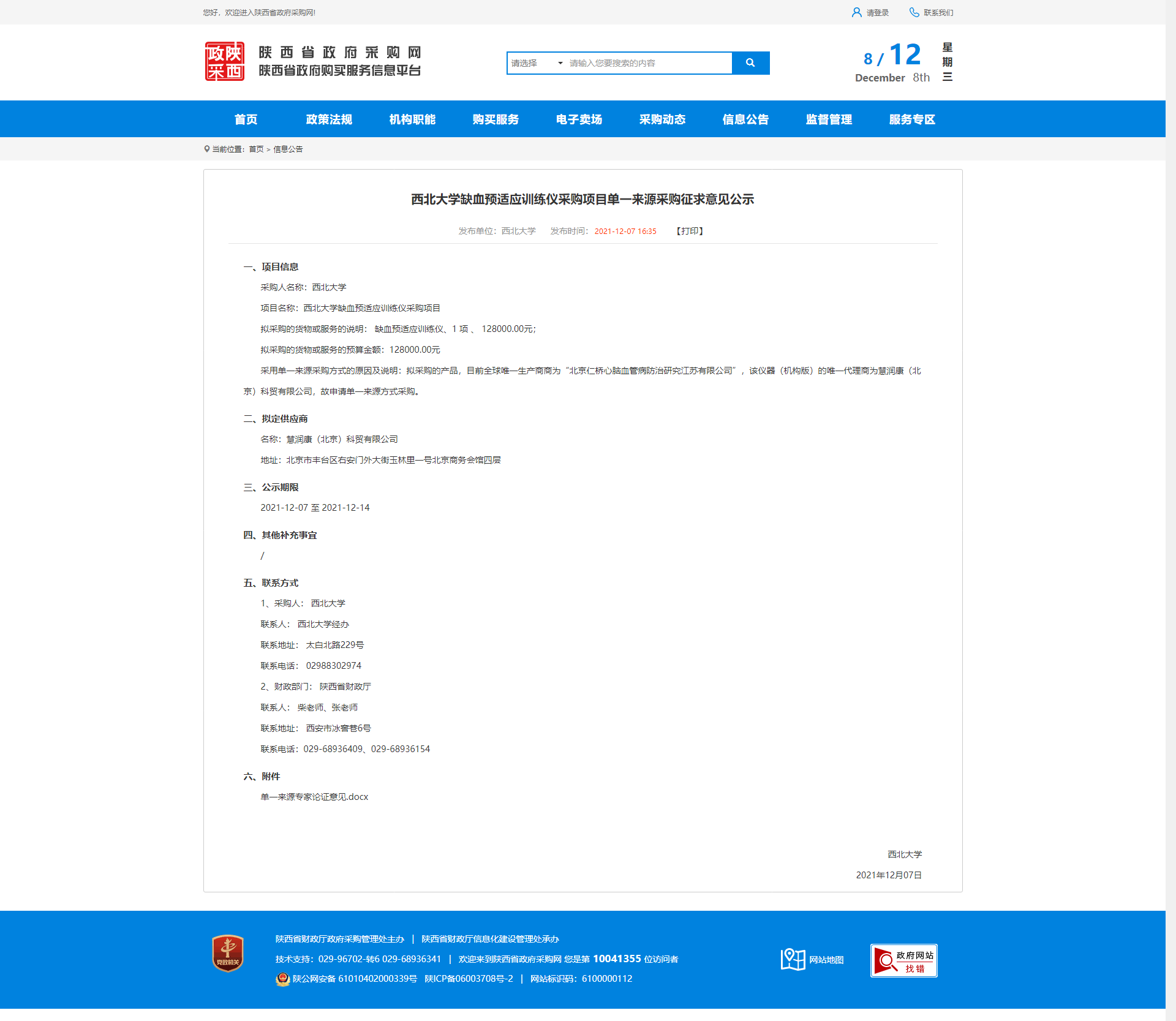 西北大学缺血预适应训练仪采购项目单一来源采购征求意见公示 作者: 编辑:薛利娟 时间:2021-12-08 原公告链接:http://www.ccgp-shaanxi.gov.cn/notice/noticeDetail.do?noticeguid=8a85be347d6a75c8017d9407fc0b61e6