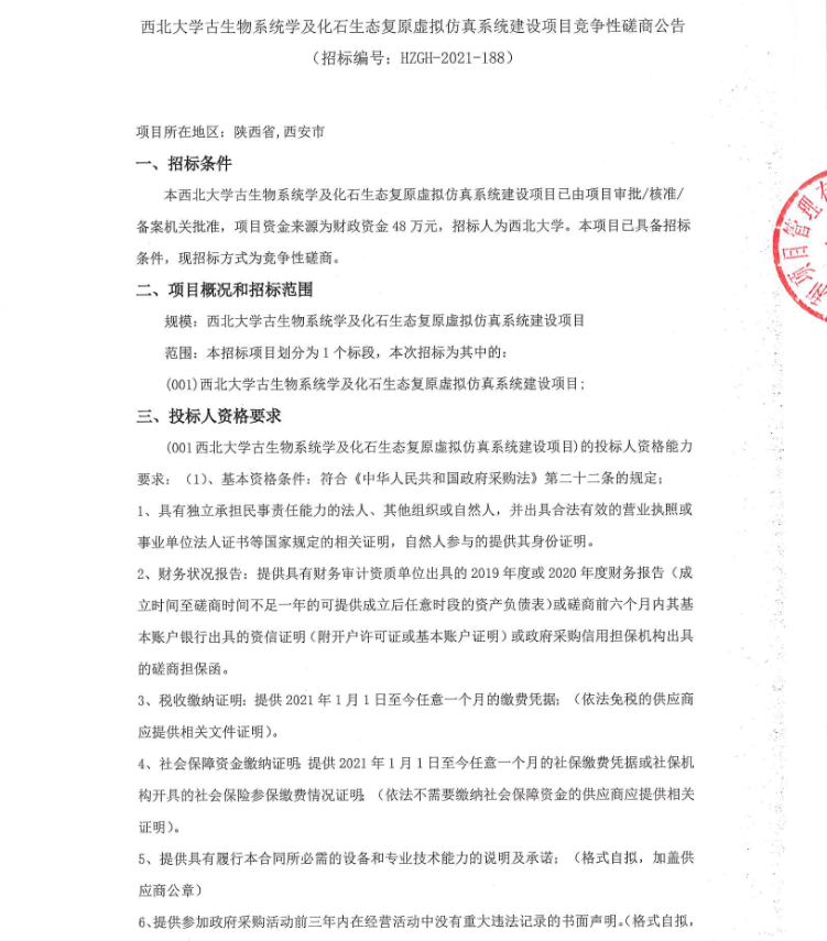 西北大学古生物系统学及化石生态复原虚拟仿真系统建设项目竞争性磋商公告