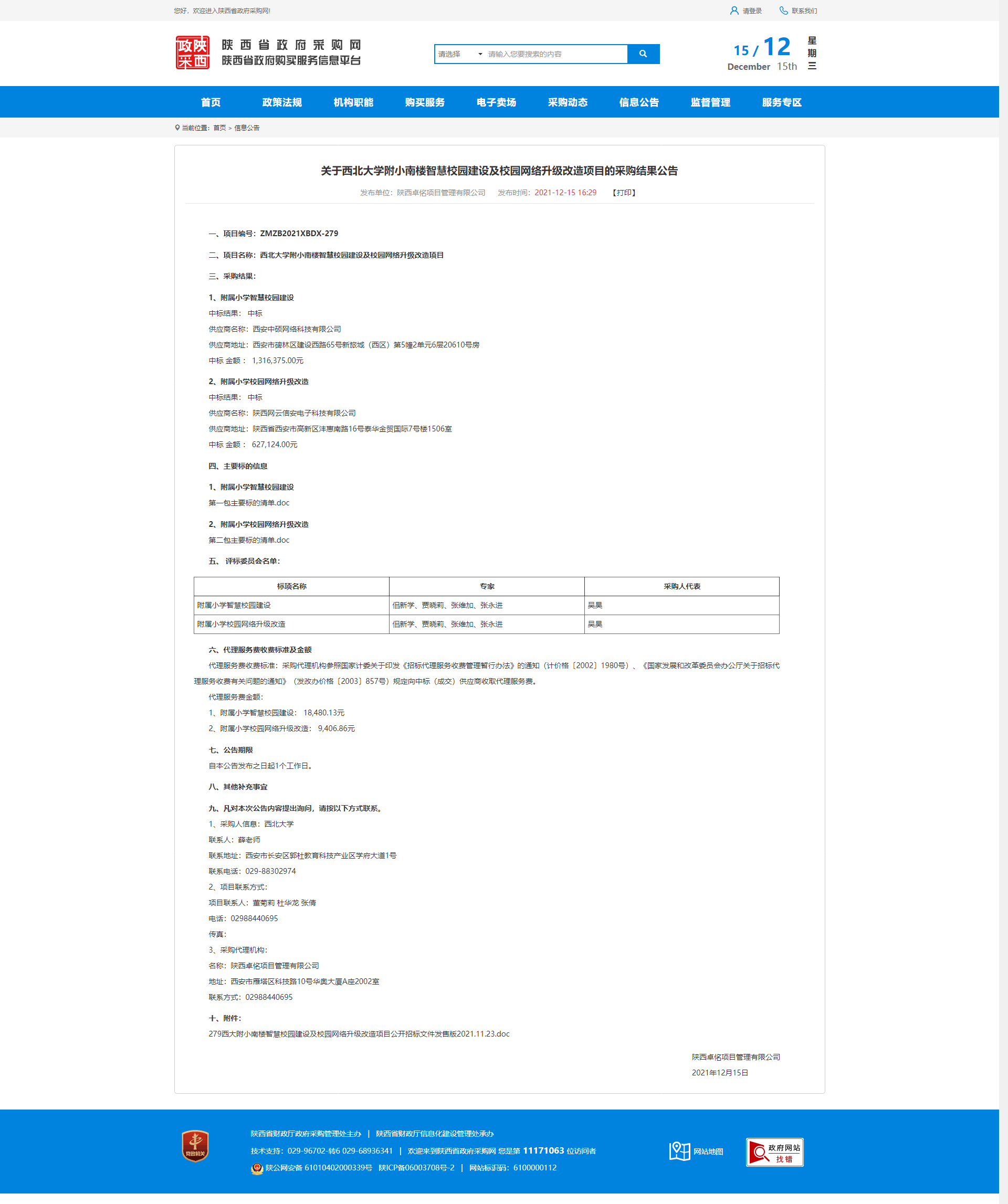 关于西北大学附小南楼智慧校园建设及校园网络升级改造项目的采购结果公告 作者: 编辑:薛利娟 时间:2021-12-15 原公告链接:http://www.ccgp-shaanxi.gov.cn/notice/noticeDetail.do?noticeguid=8a85be317dacefac017dbd0b5be51ce5