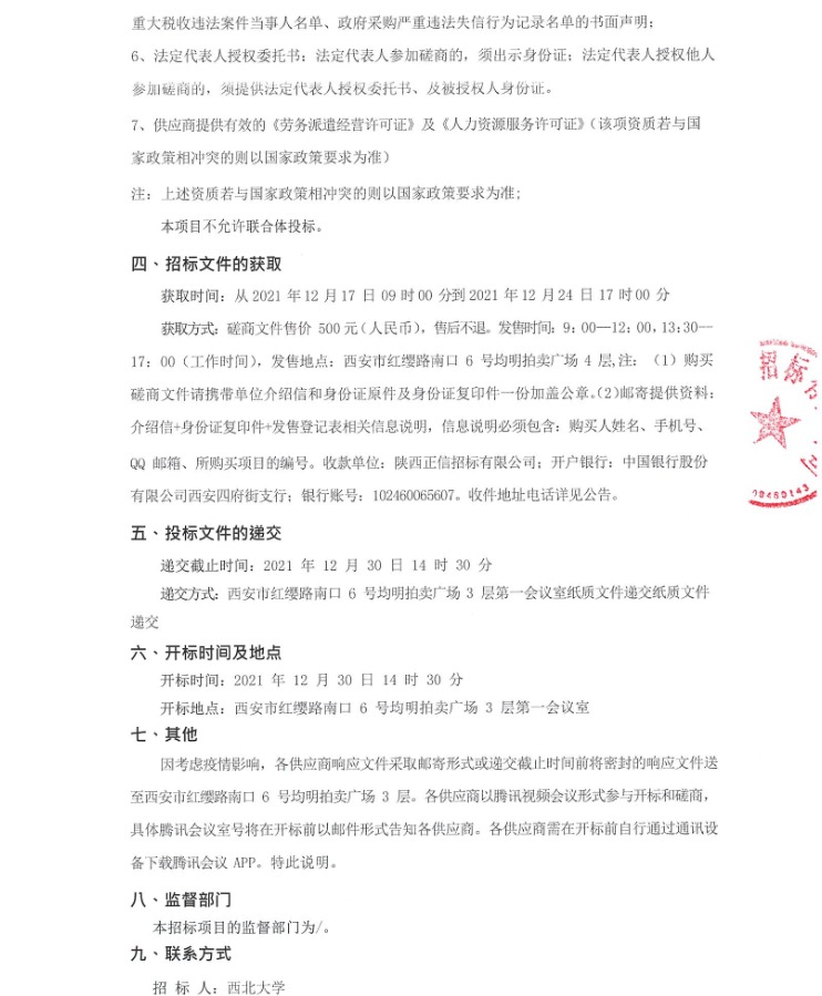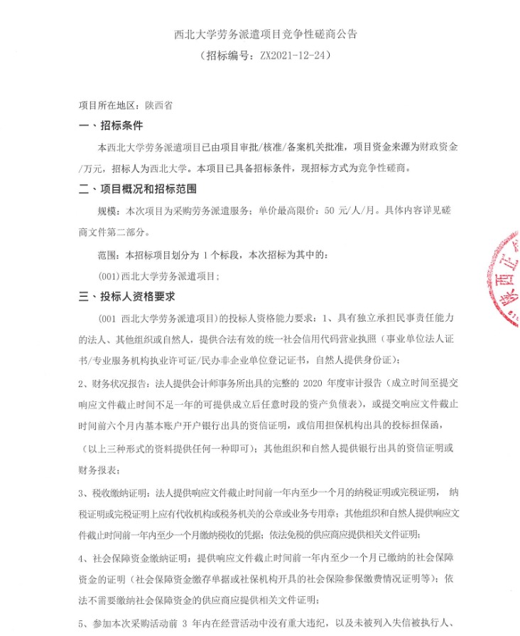 西北大学劳务派遣项目竞争性磋商公告