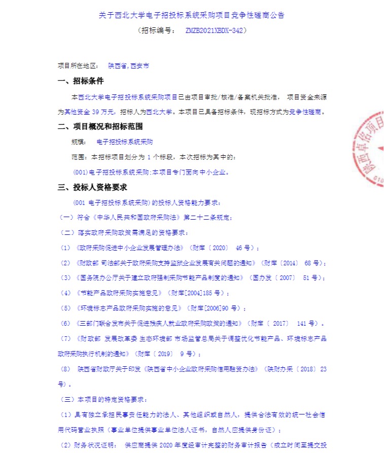 西北大学电子招投标系统采购项目竞争性磋商公告