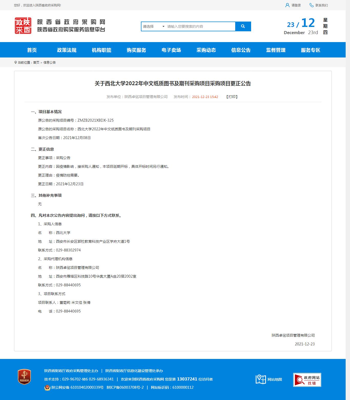 关于西北大学2022年中文纸质图书及期刊采购项目采购项目更正公告 作者: 编辑:薛利娟 时间:2021-12-23 原公告链接:http://www.ccgp-shaanxi.gov.cn/notice/noticeDetail.do?noticeguid=8a85be327dace5d8017de63c777e2f27