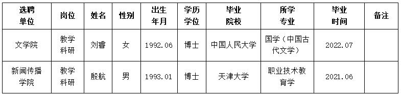 经用人单位推荐,人力资源部审查,学校教学督导及院系相关专家考核,我校拟确定下列人员来校工作。本着公平、公正、公开的原则,现将本次拟选聘人员基本情况公示如下: