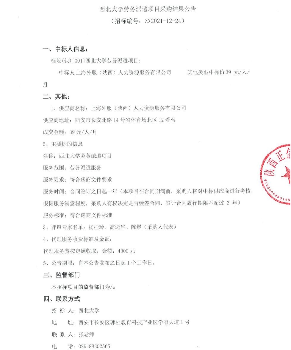 关于西北大学劳务派遣项目采购结果公告