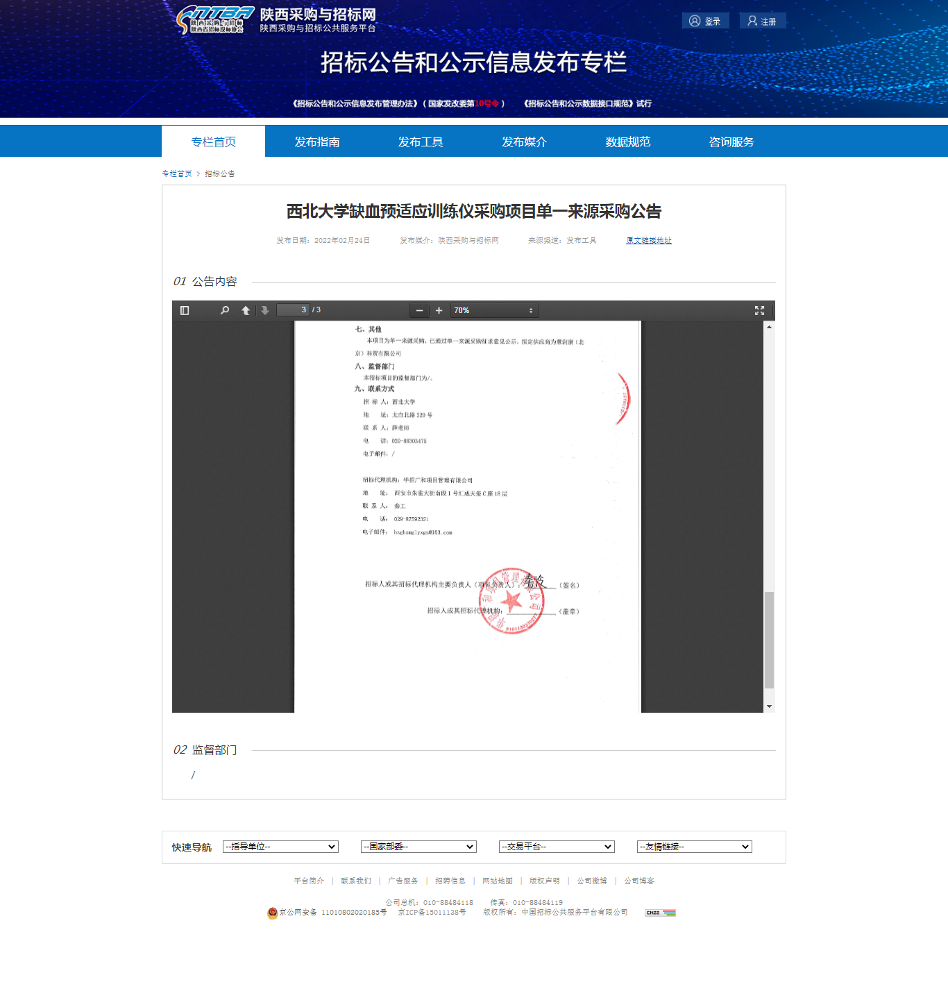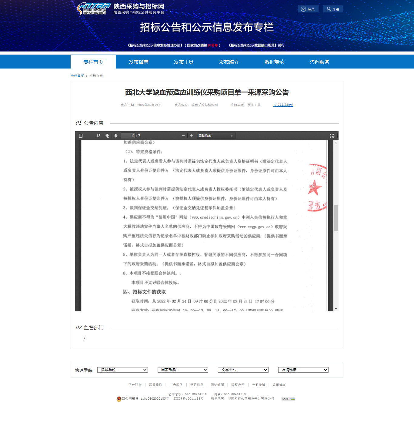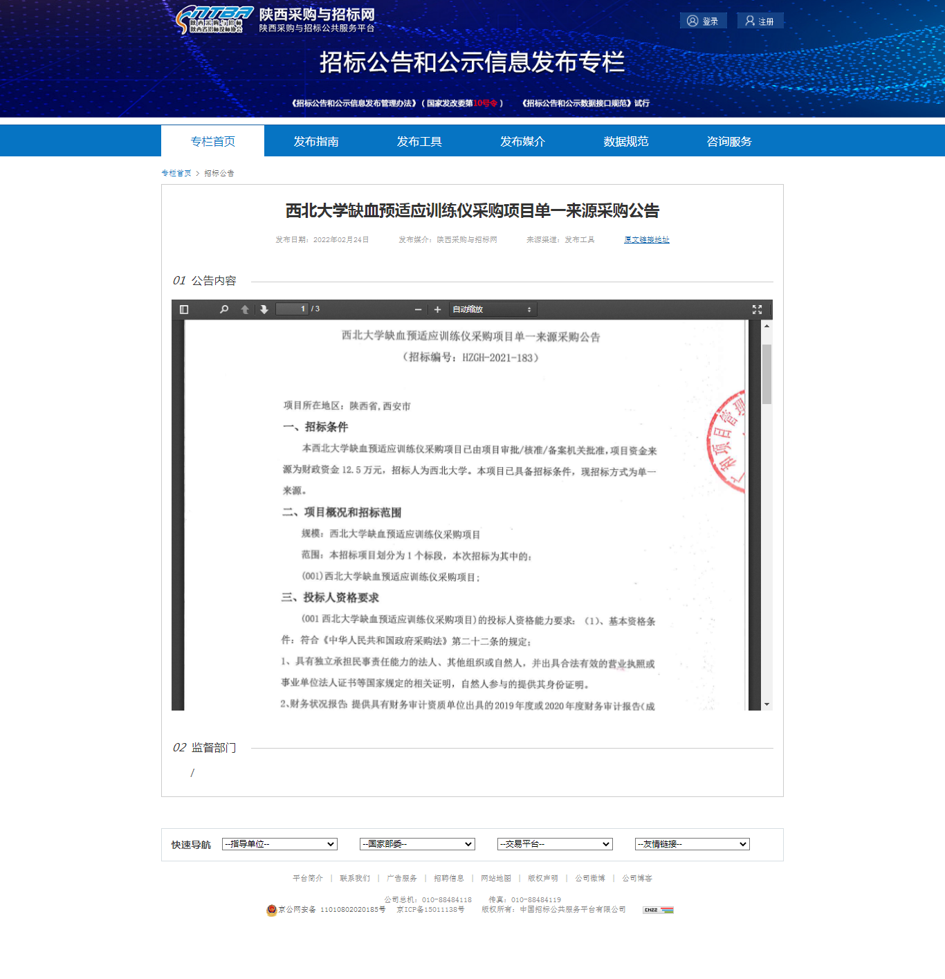 西北大学缺血预适应训练仪采购项目单一来源采购公告 作者: 编辑:薛利娟 时间:2022-02-24 原公告链接:http://bulletin.sntba.com/biddingBulletin/2022-02-24/392495.html
