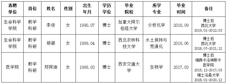 关于教学科研单位选聘教师情况的公示 作者: 编辑:岗位聘用办公室 时间:2022-03-21 经用人单位推荐,人力资源部审查,学校教学督导及院系相关专家考核,我校拟确定下列人员来校工作。本着公平、公正、公开的原则,现将本次拟选聘人员基本情况公示如下: 各单位或个人如对上述人选存有疑问,可在2021年3月27日前以书面形式向人力资源部反映。反映材料须实名提交,以便我部核实并反馈,我们将严格保密。(因疫情防控,公示期结束后签订三方协议、开具接收函等手续,请联系工作人员沟通确定后另行办理。) 联系电话:029-88308221 15129051753 西北大学人力资源部 2022年3月21日