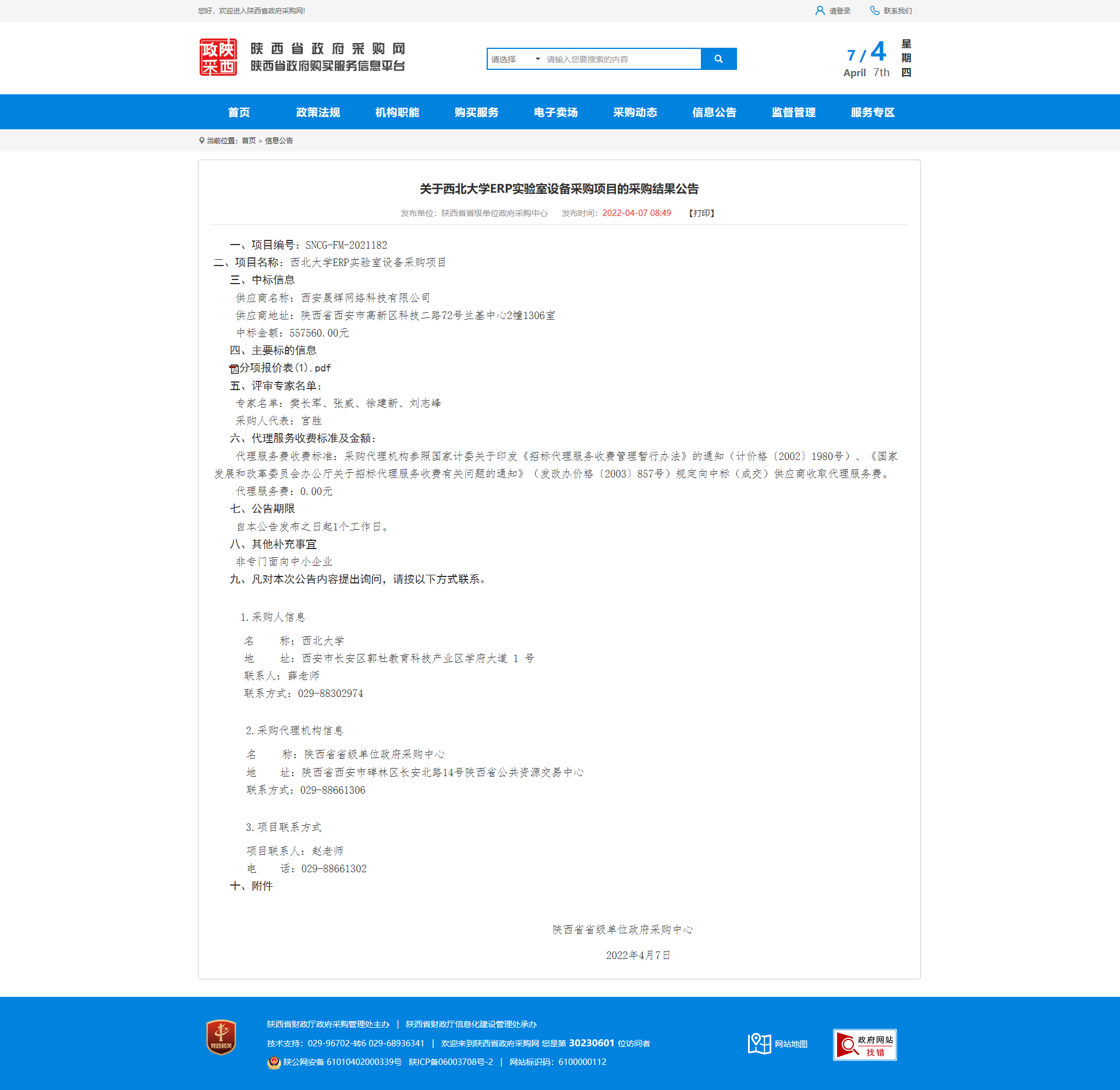 关于西北大学ERP实验室设备采购项目的采购结果公告 作者: 编辑:薛利娟 时间:2022-04-07 原公告链接:http://113.200.80.230/notice/noticeDetail.do?noticeguid=8a85be387f91f0bf0180019dab1c001f