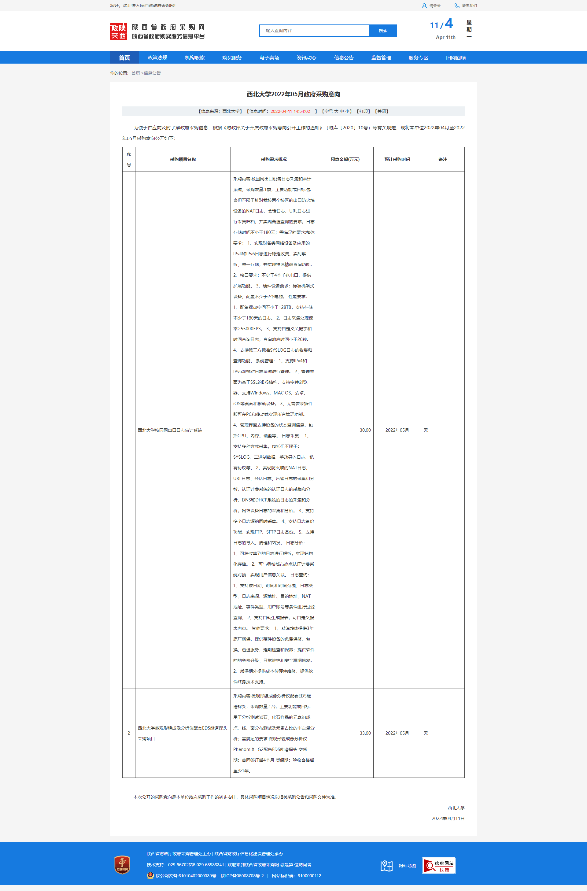 西北大学2022年05月政府采购意向 作者: 编辑:薛利娟 时间:2022-04-11 原公告链接:http://www.ccgp-shaanxi.gov.cn/freecms/site/shaanxi/ggxx/info/2022/8a69c92a80033b740180168305694239.html?noticeType=59¬iceId=4c032207-b964-11ec-9a8e-08c0eb20c666