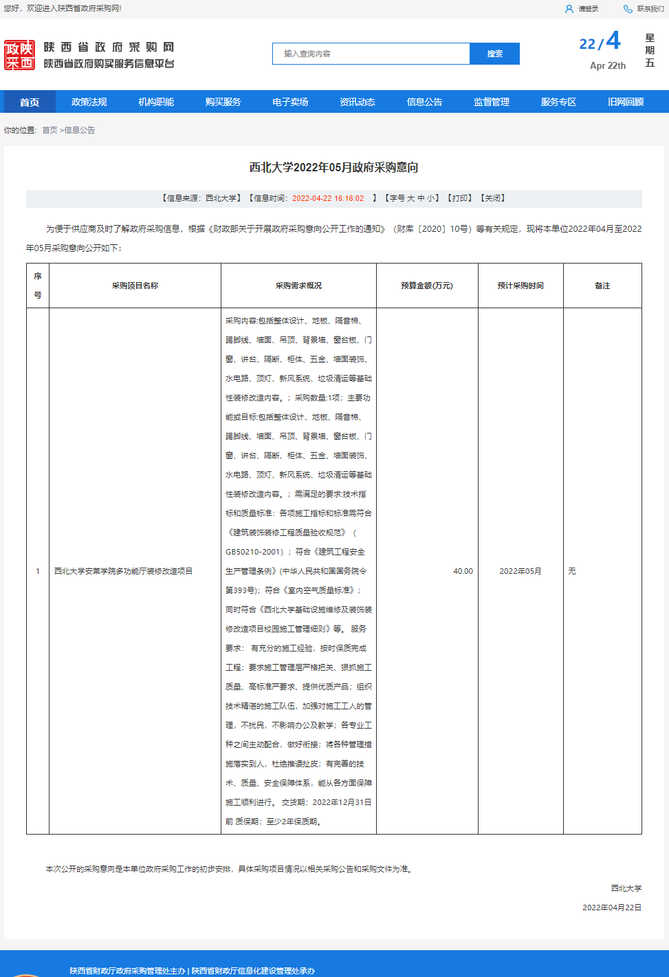 西北大学2022年05月政府采购意向