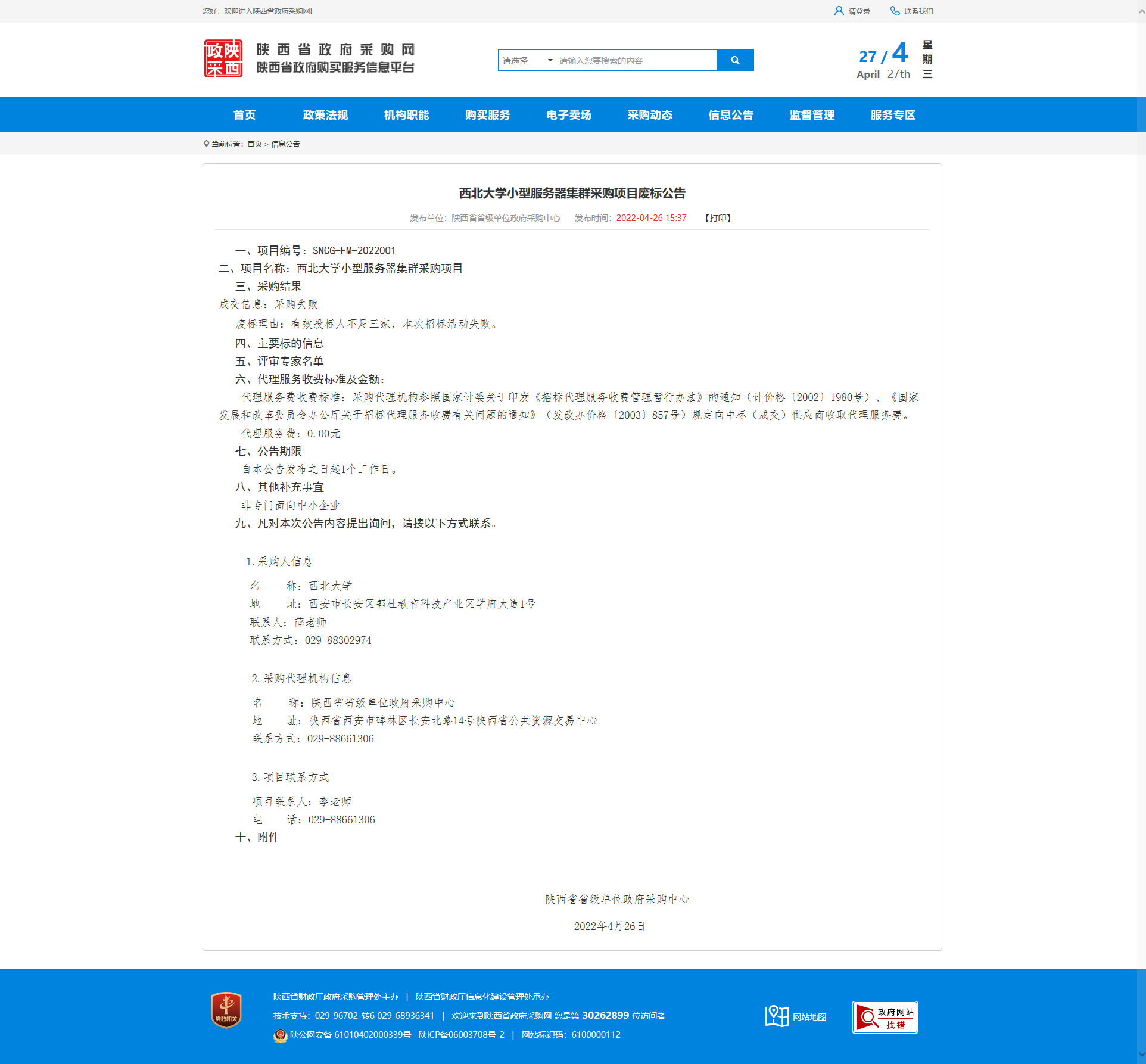 西北大学小型服务器集群采购项目废标公告 作者: 编辑:薛利娟 时间:2022-04-27 原公告链接:http://113.200.80.230/notice/noticeDetail.do?noticeguid=8a85be387f91f0bf0180654648f60035