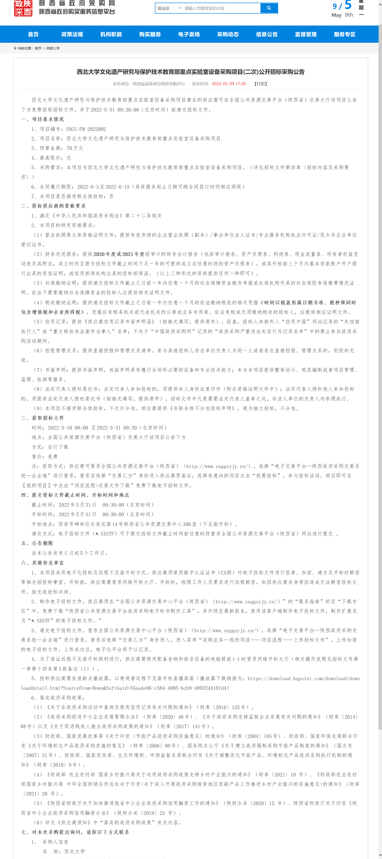 西北大学文化遗产研究与保护技术教育部重点实验室设备采购项目(二次)公开招标采购公告 作者: 编辑:薛利娟 时间:2022-05-09 原公告链接:http://113.200.80.230/notice/noticeDetail.do?noticeguid=8a85be387f91f0bf0180a8225bed003f