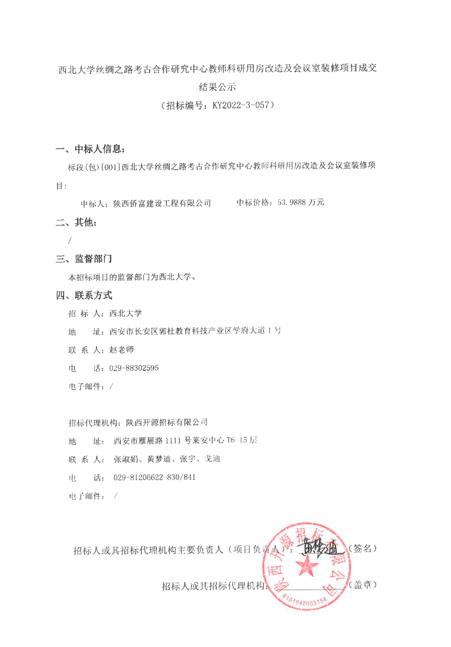 西北大学丝绸之路考古合作研究中心教师科研用房改造及会议室装修项目成交结果公示