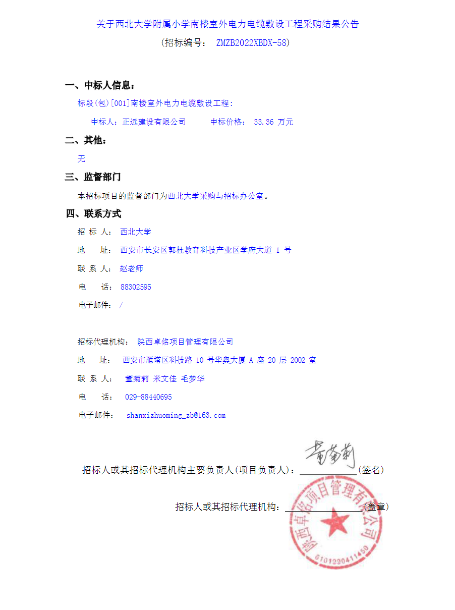 关于西北大学附属小学南楼室外电力电缆敷设工程采购结果公告