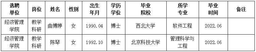 经用人单位推荐,人力资源部审查,学校教学督导及院系相关专家考核,我校拟确定下列人员来校工作。本着公平、公正、公开的原则,现将本次拟选聘人员基本情况公示如下: