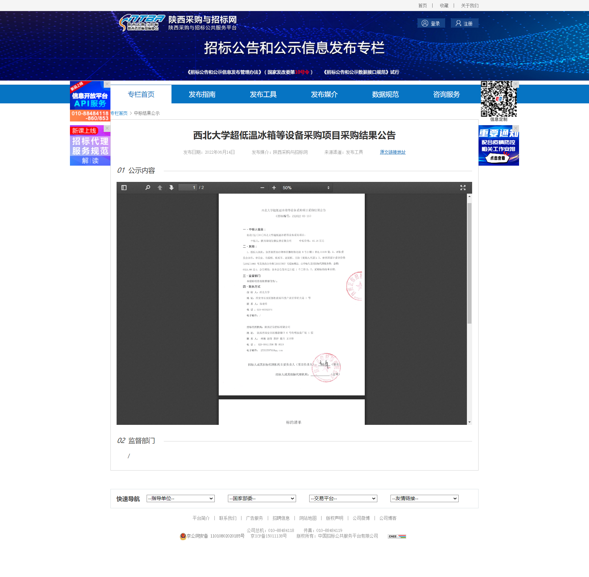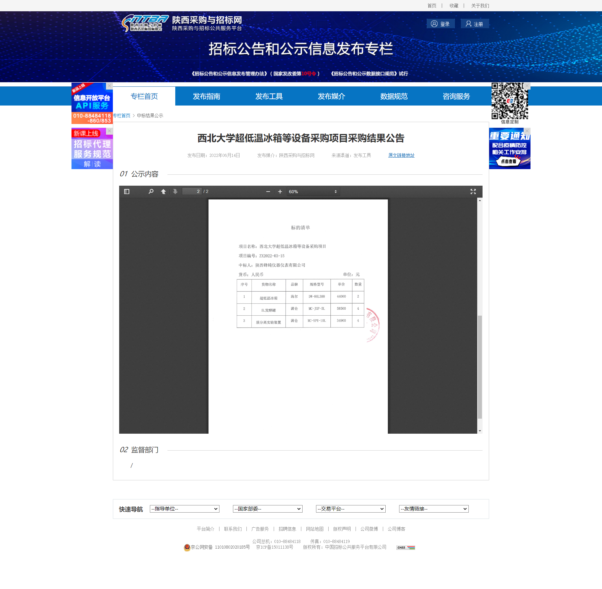 西北大学超低温冰箱等设备采购项目采购结果公告 作者: 编辑:薛利娟 时间:2022-06-14 原公告链接:http://bulletin.sntba.com/resultBulletin/2022-06-14/433311.html